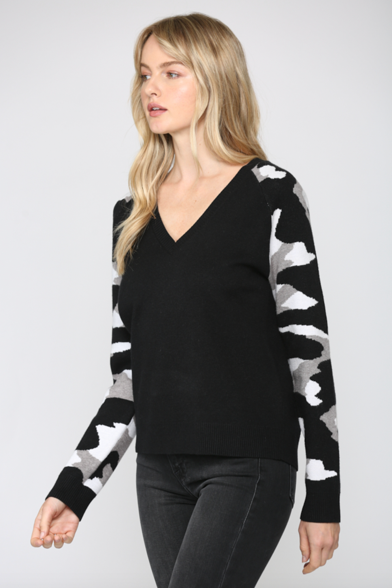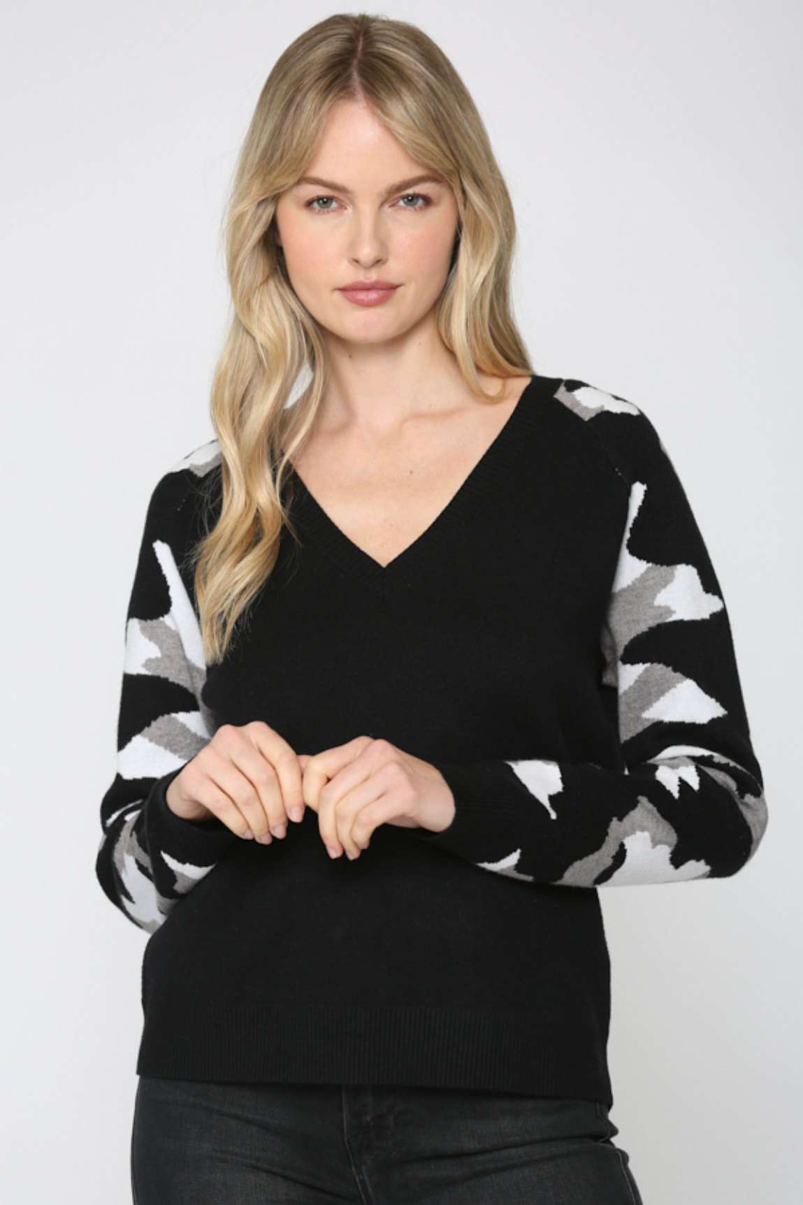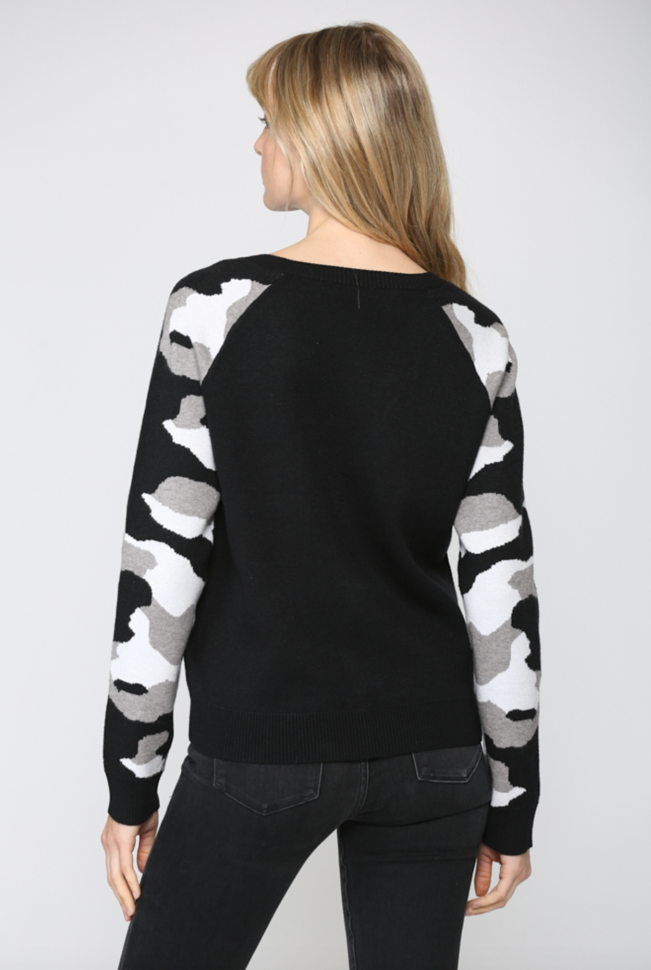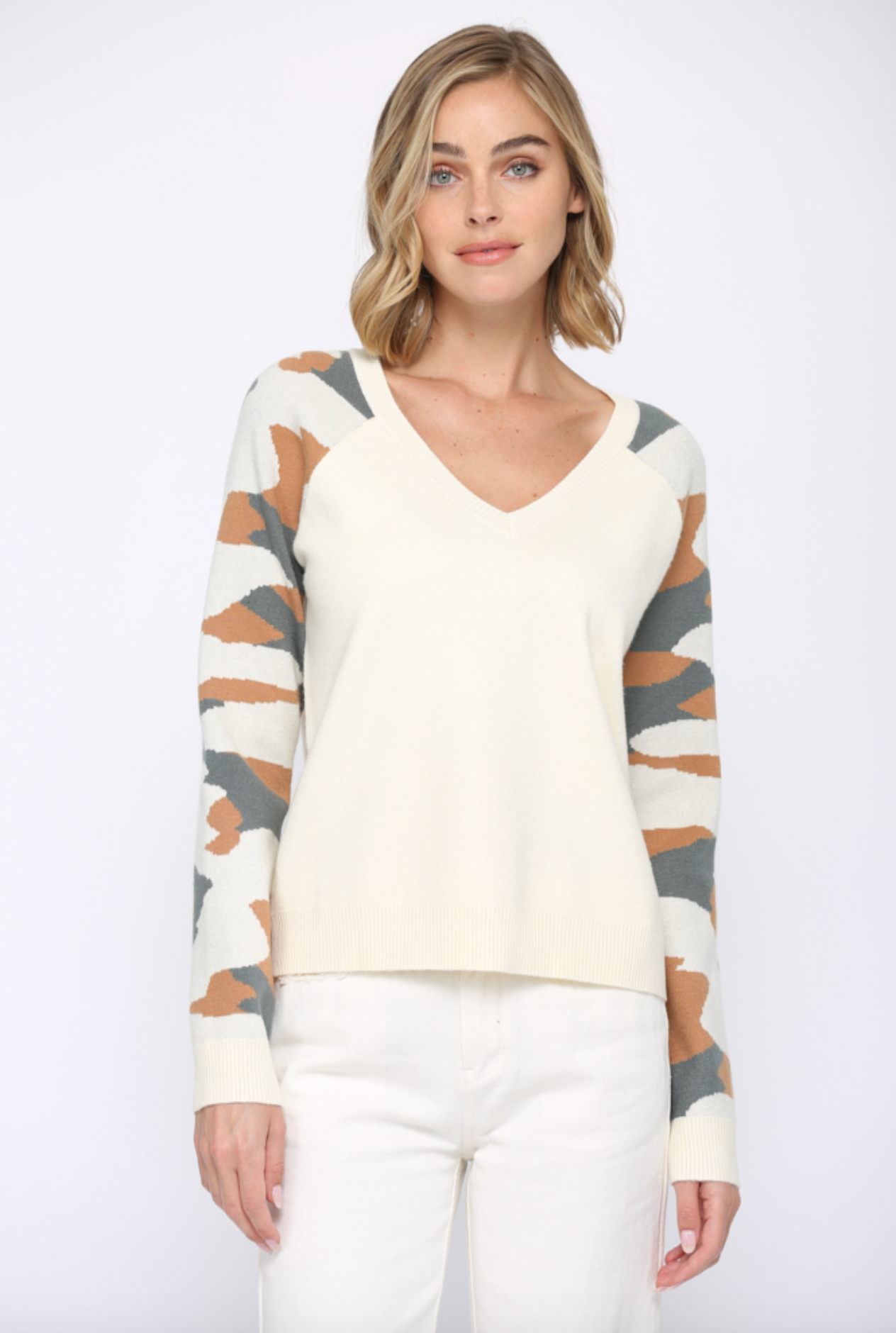 This camo sleeve seater is a super easy go to for fall. Looks great with any bottom. Fits more like a blouse/knit top than a typical fall sweater.