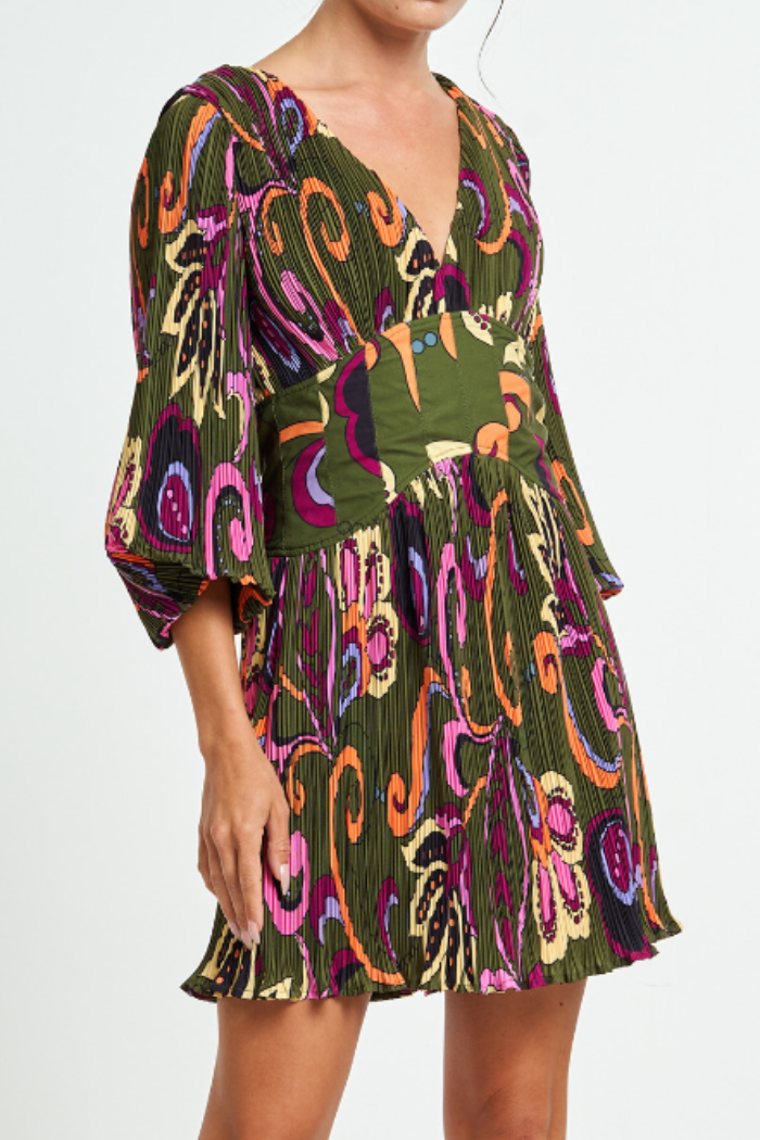 Groovy and fun. This pleated dress is full of twirl and great a great feeling. Zipper back, defined waist line. Pair with boots or heels.