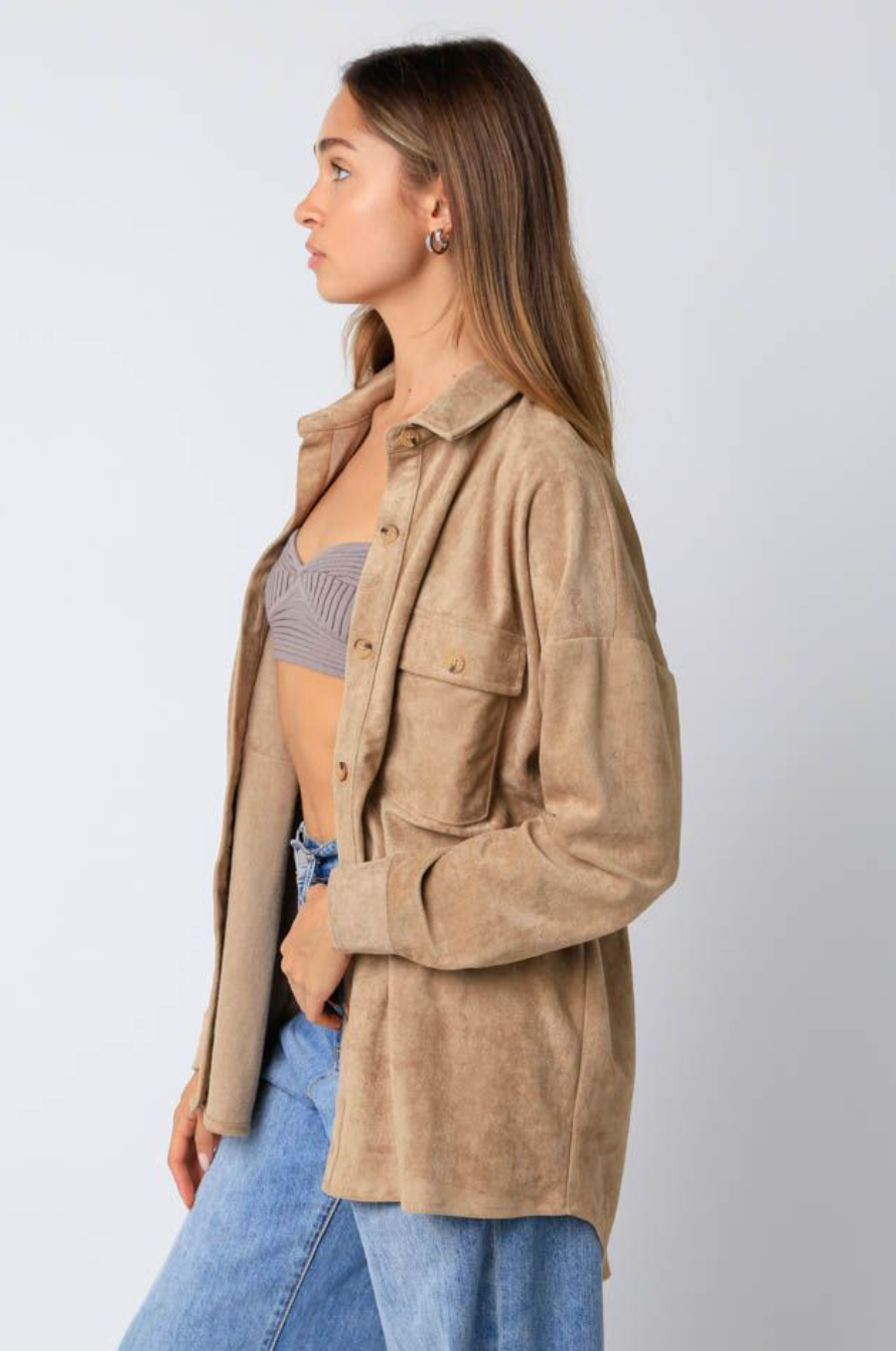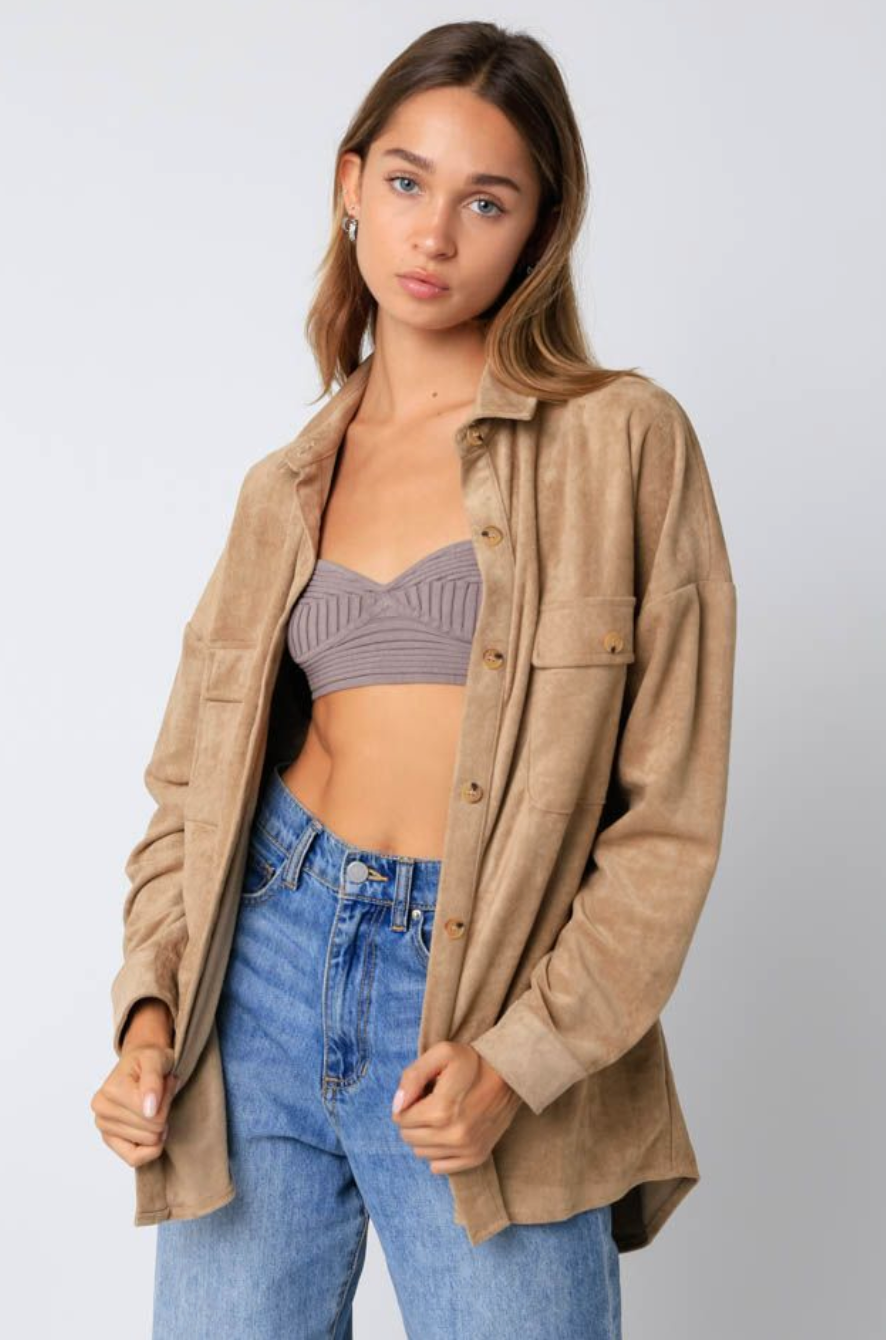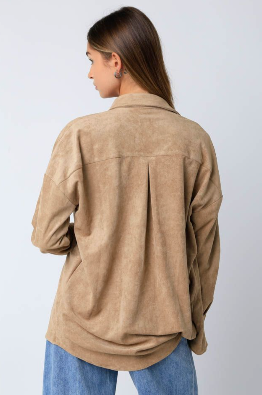 Our Cara Suede Top features front button down closure and a flap pockets.