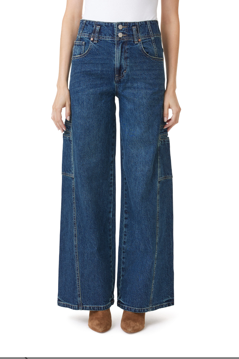 On trend extra wide leg, cargo jean with seam detail and banded button waistband. This jean is all about the details and a fall must have.