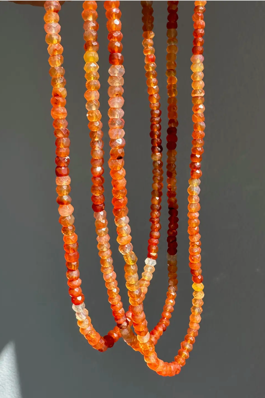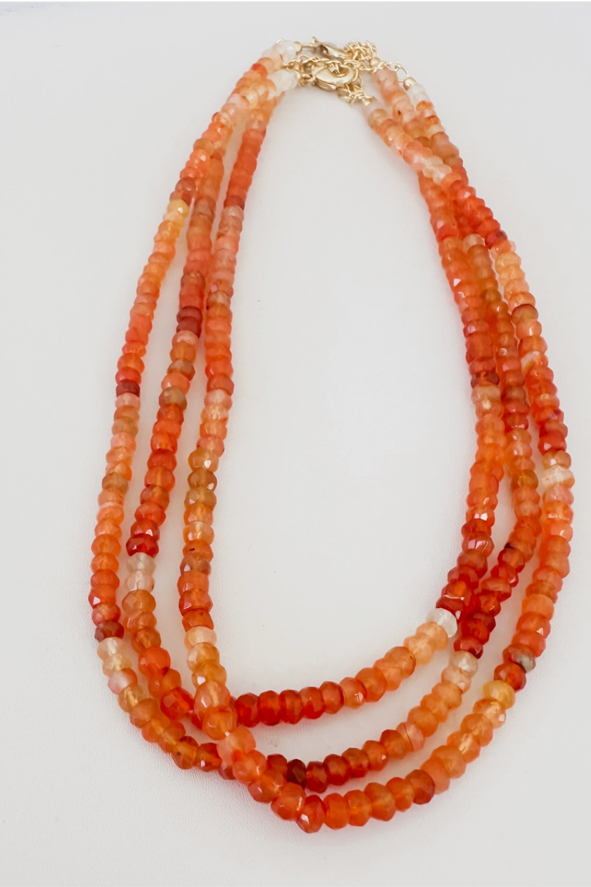 Carnelian Necklace with faceted ombre beads. This is a very popular gemstone in the yoga + mindfulness community as it is a symbol of strength and courage. Necklace is 16" + 2" extender with 18K gold plated clasp.