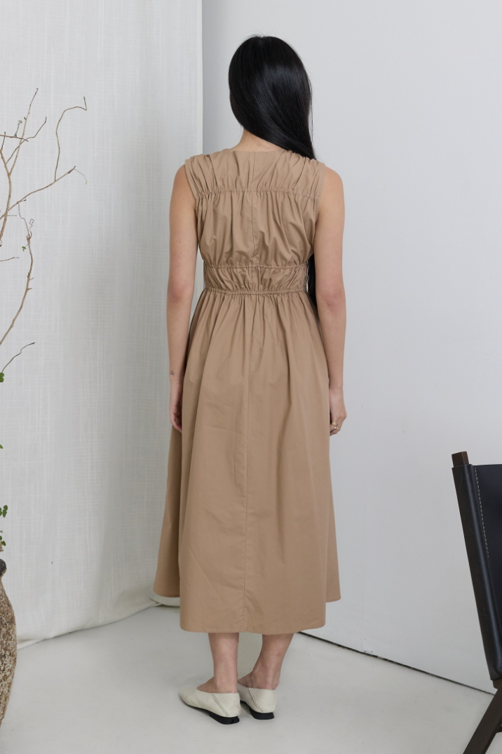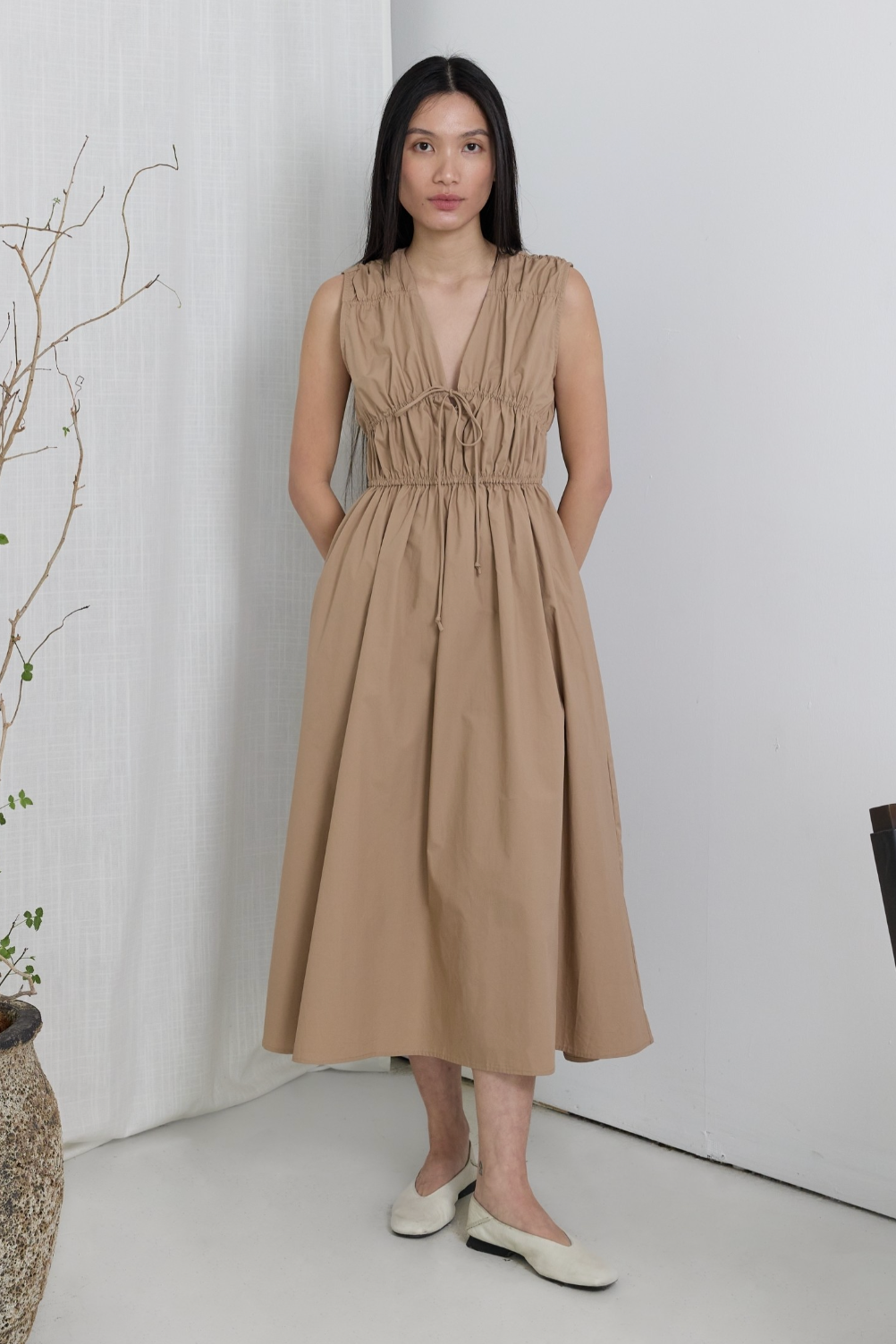 The Cecilia Dress is a charming midi dress featuring a drawstring at the bust for adjustable ruching and a customized fit. The elasticated waist ensures comfort and ease, while hidden side pockets provide convenient storage for small essentials.