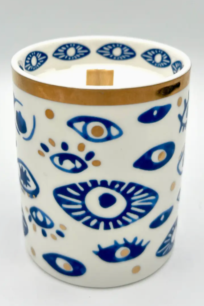 Complex, sophisticated scent profiles and premium, plant-based ingredients like coco-soy wax and essential oils and wood wicks make for a long-lasting, luxurious candle. Our beautiful "Evil Eye" ceramic and gold vessel is available in two different scent offerings: A Seductive Oud, Bergamot, Lavender, Patchouli, Basil & Amber blend (our most popular candle scent!) or an uplifting blend of Lavender, Sage & Sandalwood.