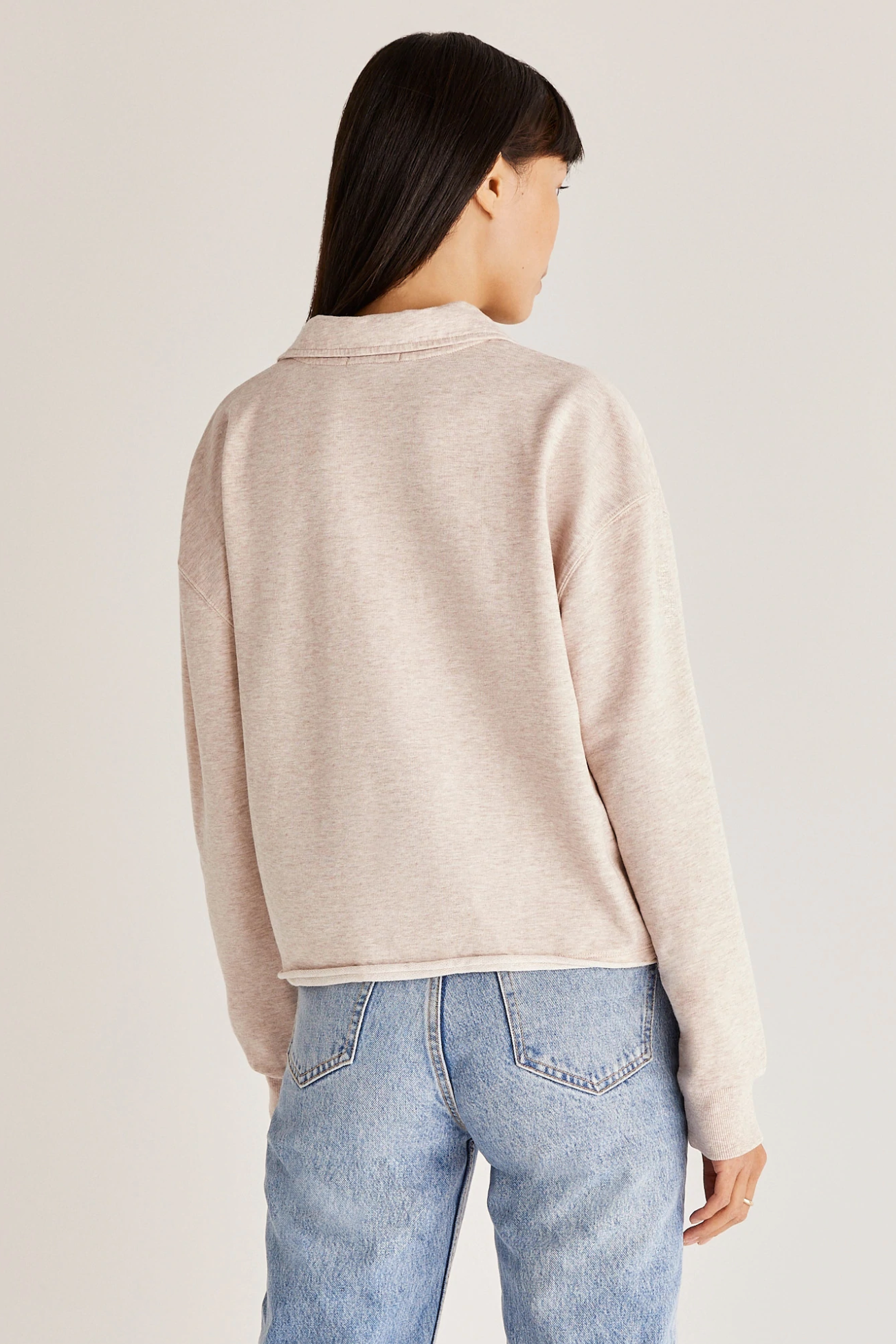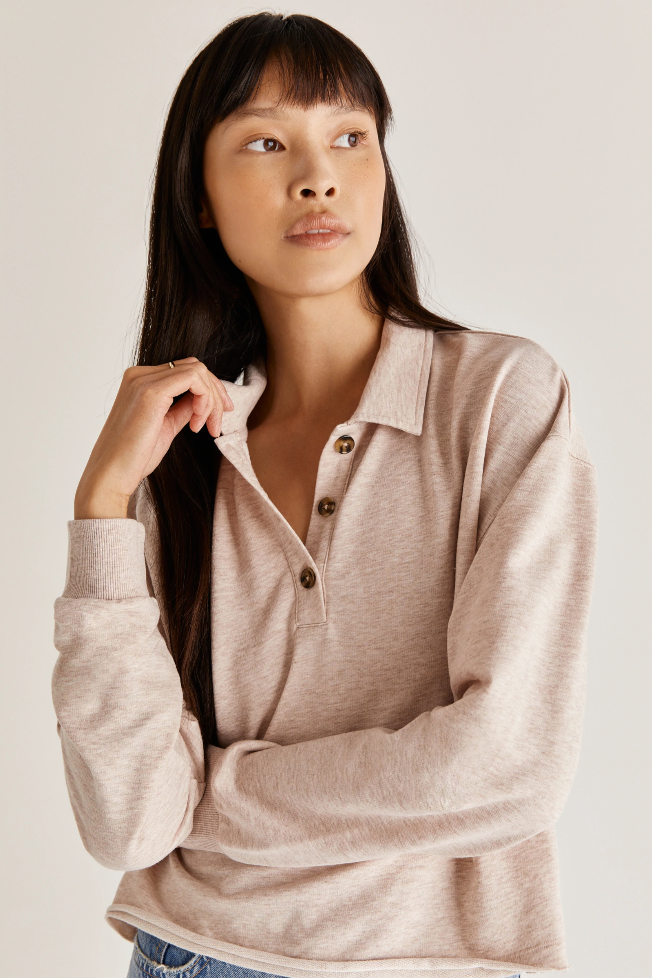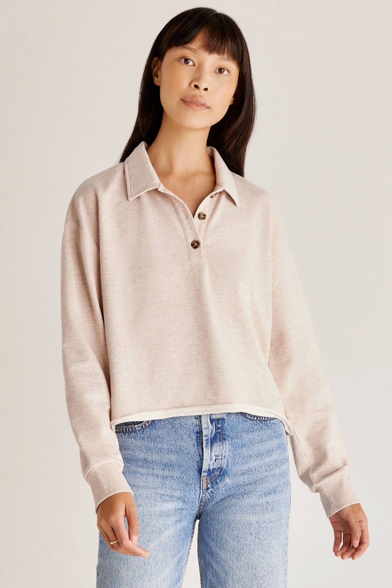 A polo never goes out of style! The Charlie Polo Sweatshirt comes in our Baby Fench Terry fabric with a collar, button closures at the neck, and raw edge detail.