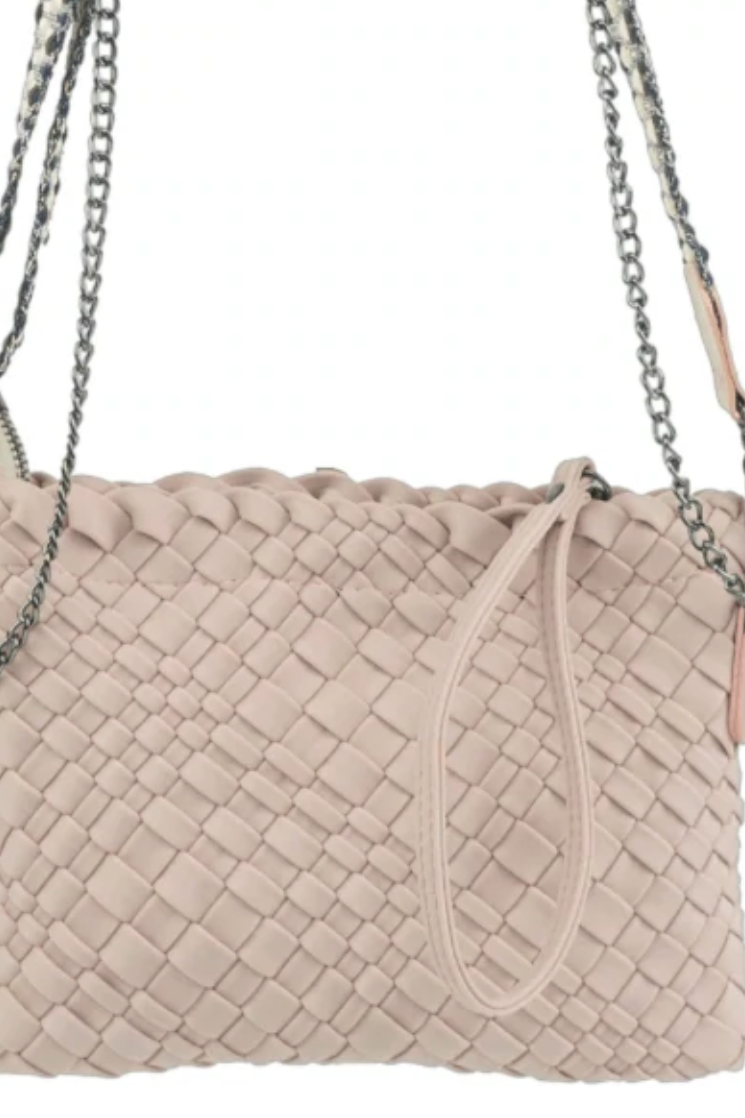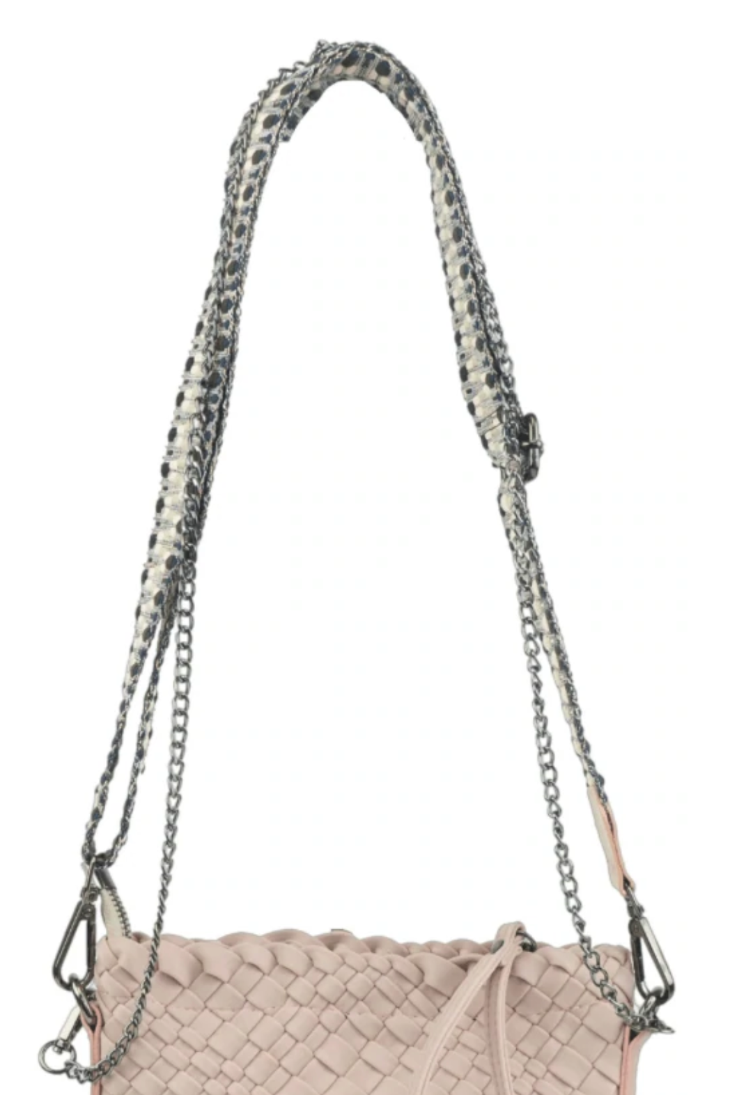 Comes with two straps. A fashionable woven strap for everyday and a classic gunmetal chain strap that can be worn long or looped for a more compact, handbag look.