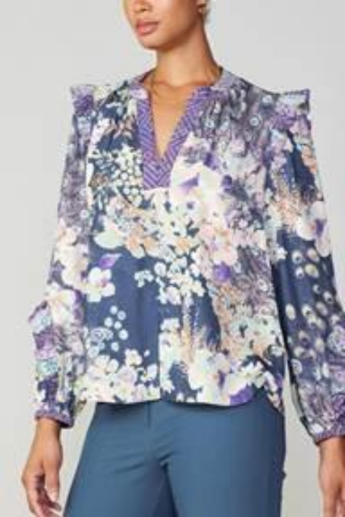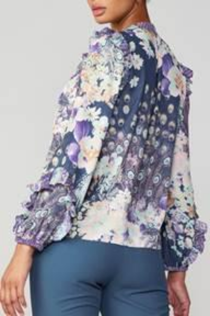 V-Neck top with ruffle detail sleeve. Full of color and fun.Pair with jeans and wedge heels.