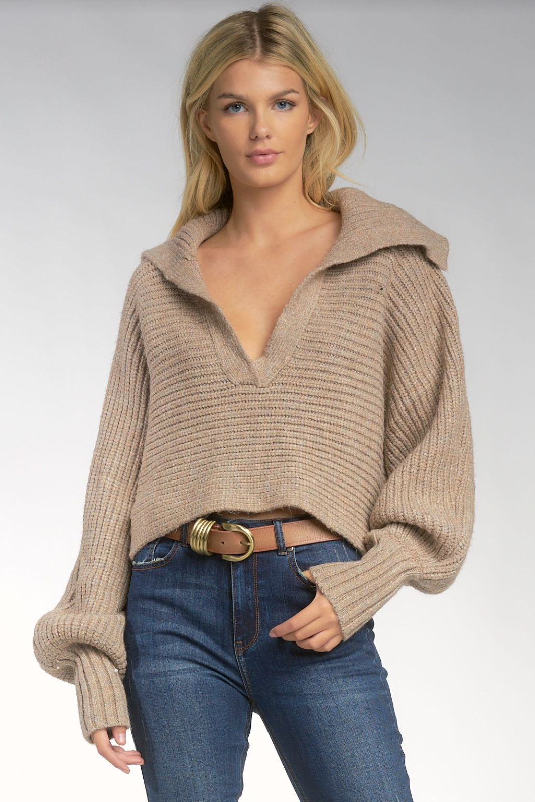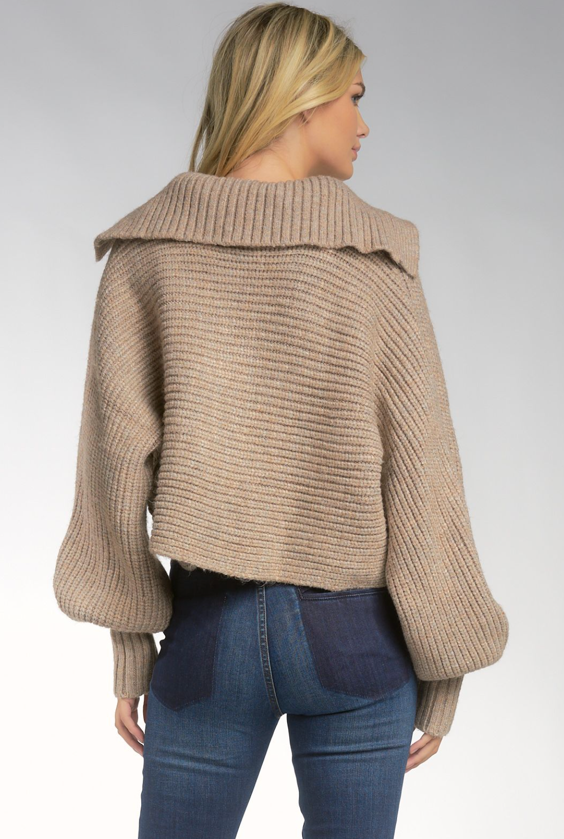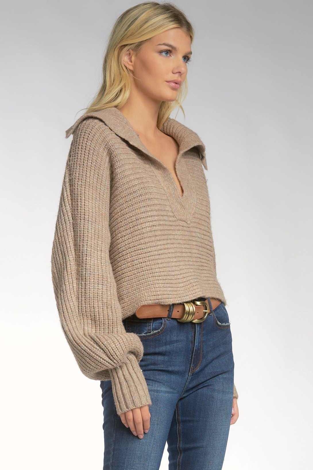 Collared taupe sweater that has balloon sleeve detail and looks great with black or dark blue jeans.