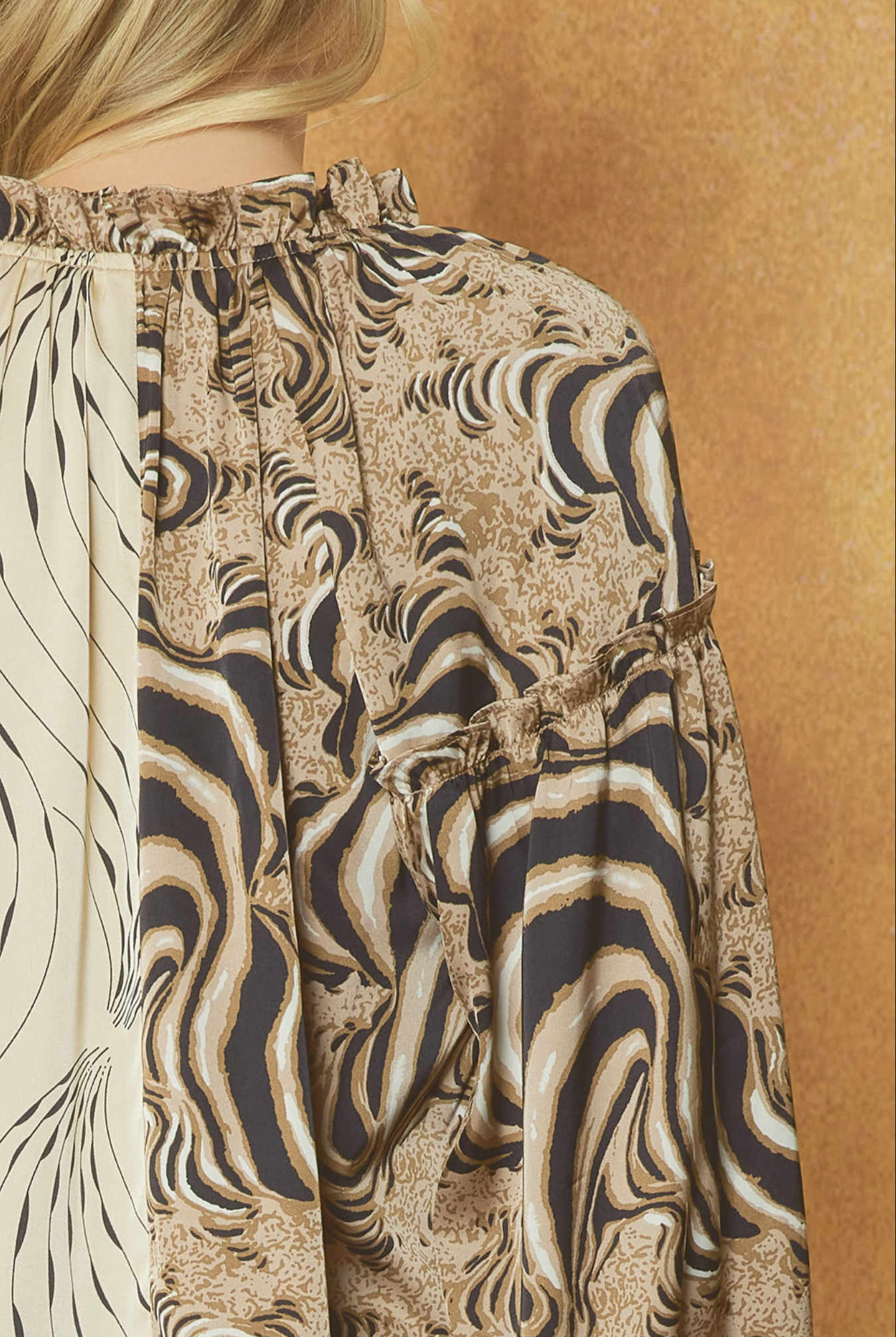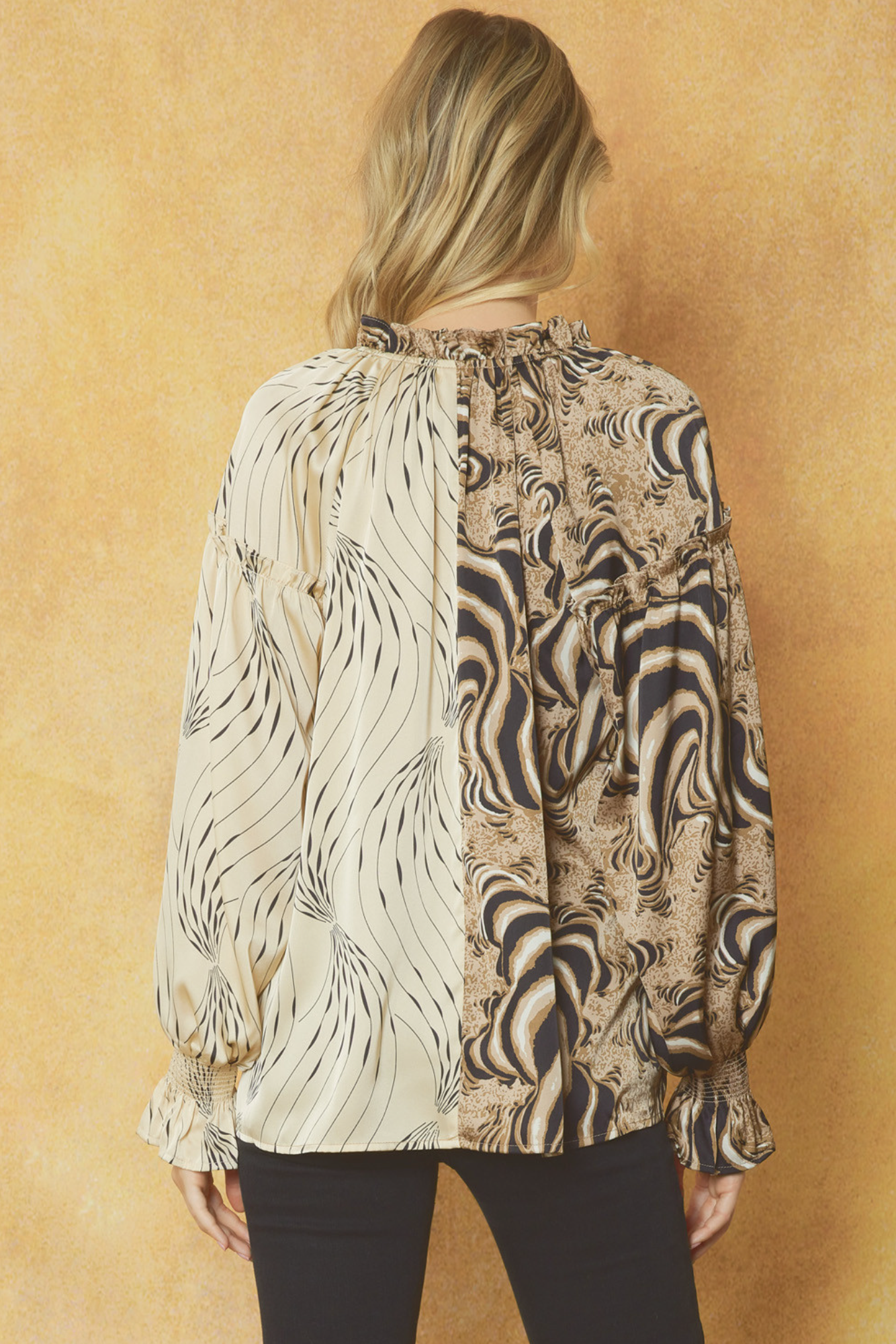 This contrast print v-neck has long sleeves and a button front closure. Smocked sleeves. Unlined. Woven. Non-sheer. Lightweight.
