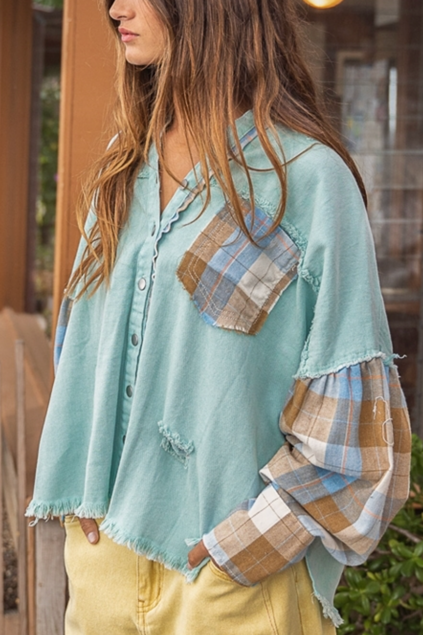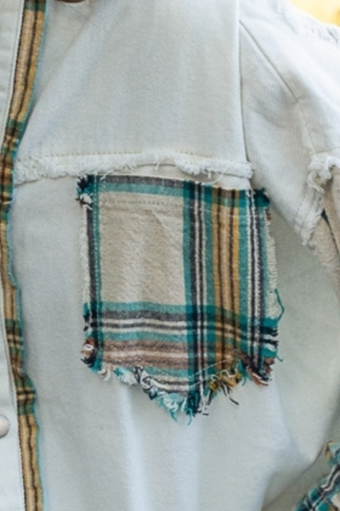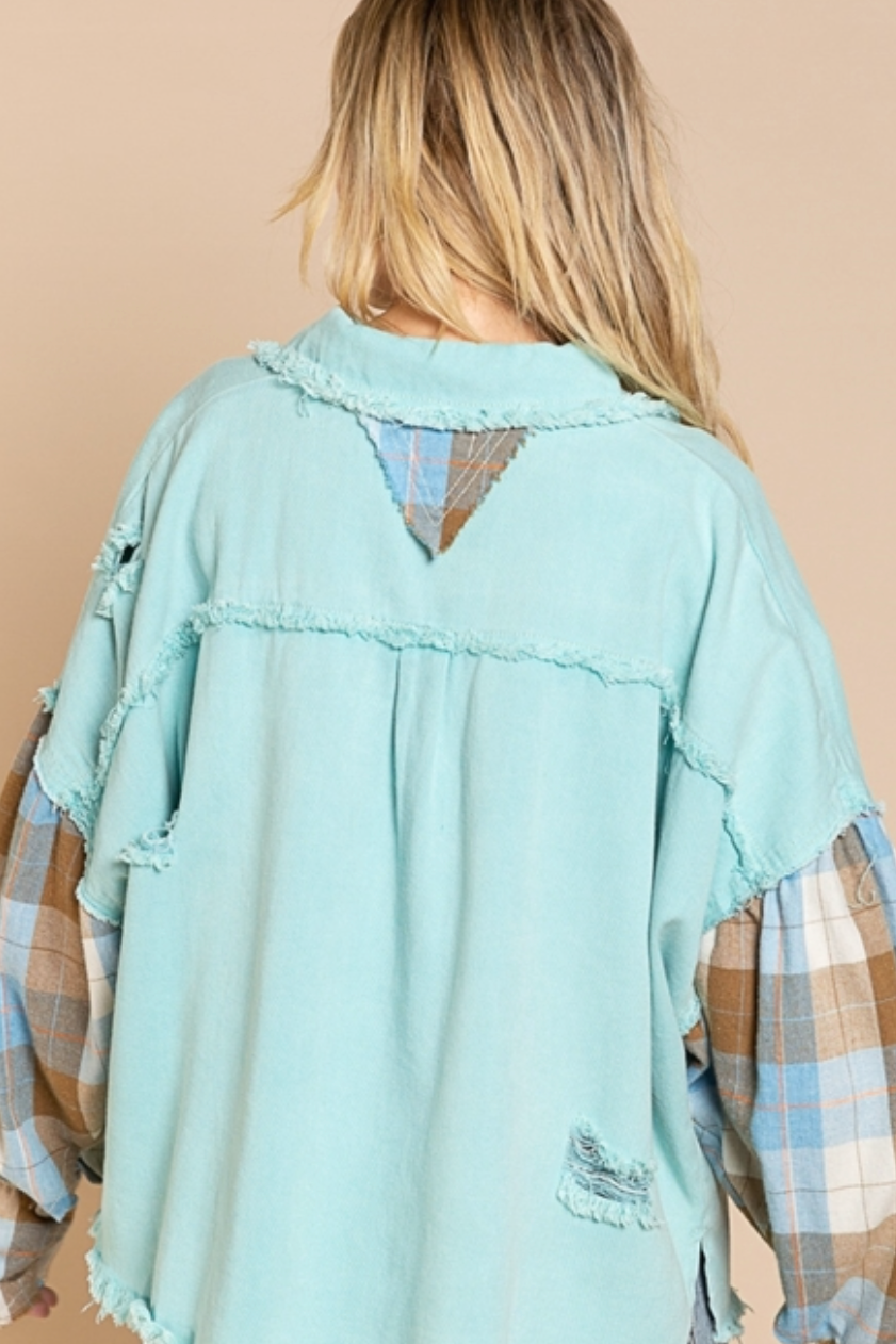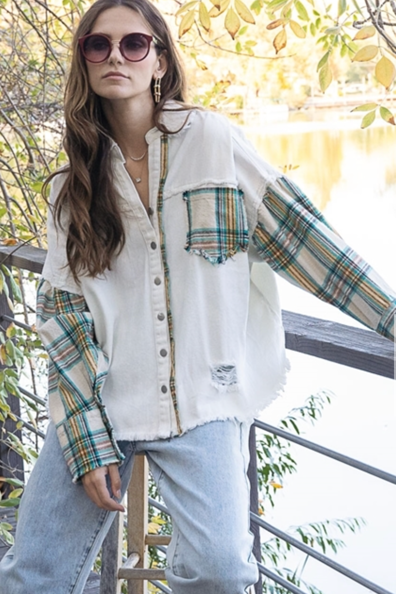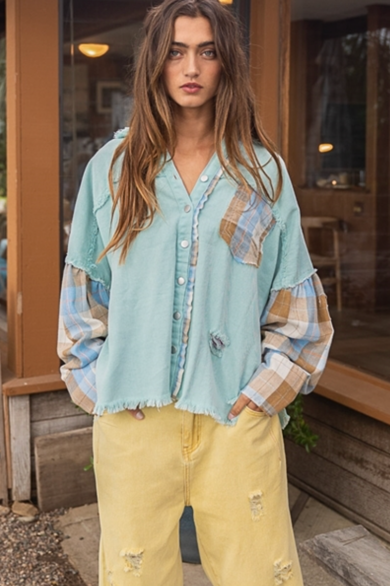 Shacket with contrast material is super fun and great to add to a basic outfit. Raw edge hemline, fabric sleeves, relaxed fit and side pockets.