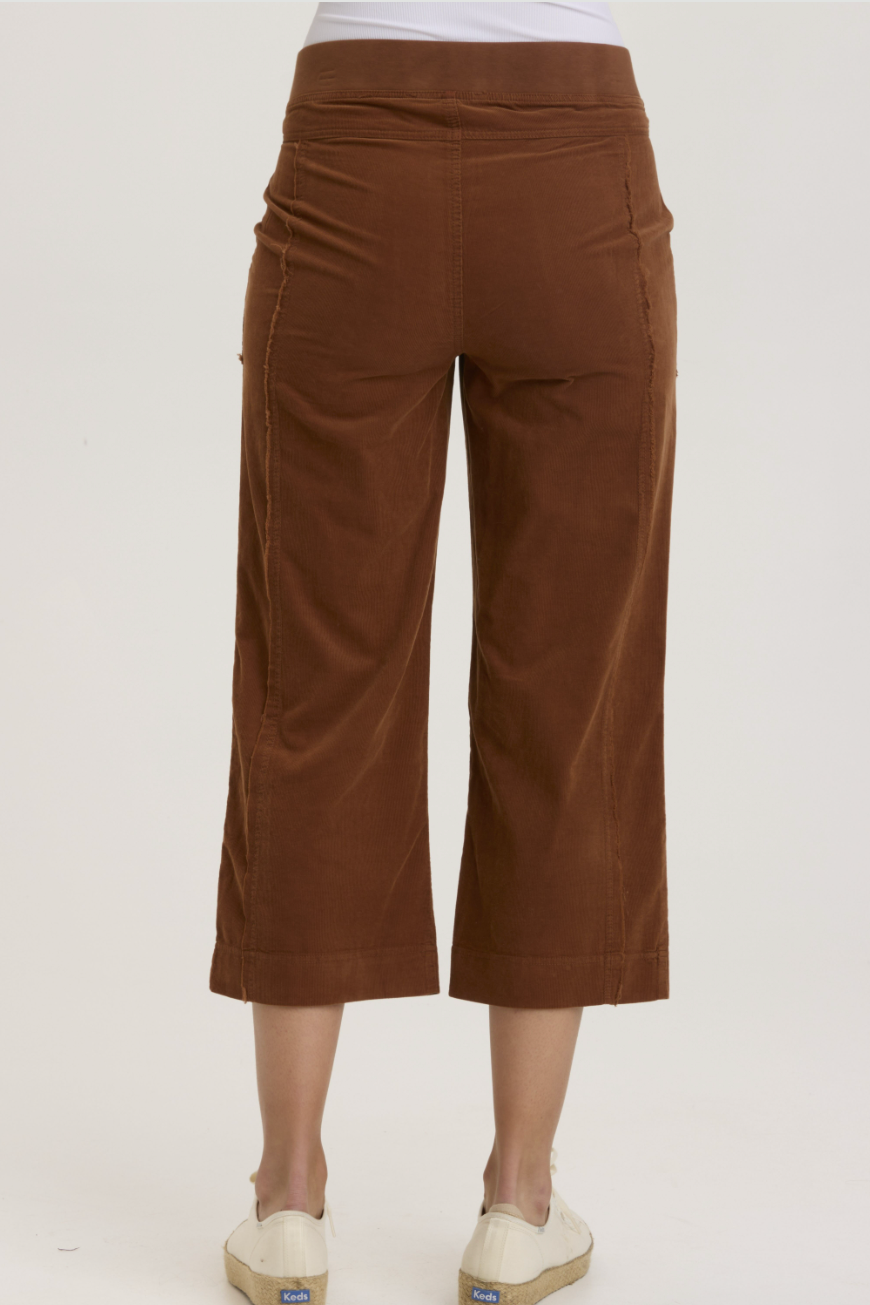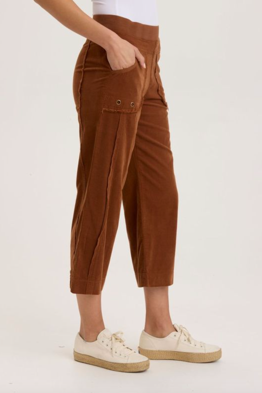 High waisted clean crops are here! Trumble is no exception! Featuring a small yoke, front raw edge pockets with eyelet details, a flared leg and clean seams.