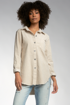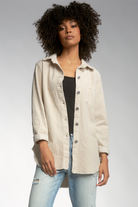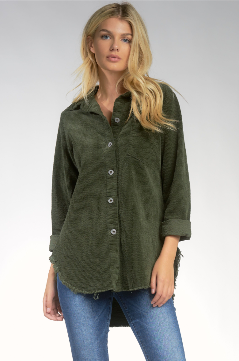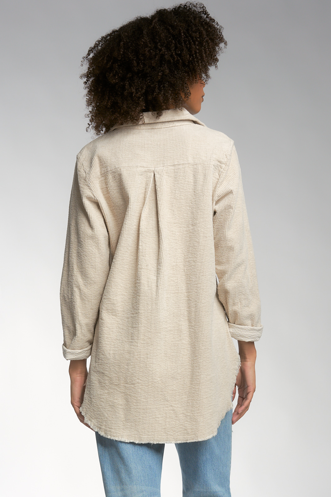 Distressed hem, soft top that can also be worn as a jacket. Edgy, soft rotated through your closet often. Pair with a felt hat and jeans. Model wearing size small.