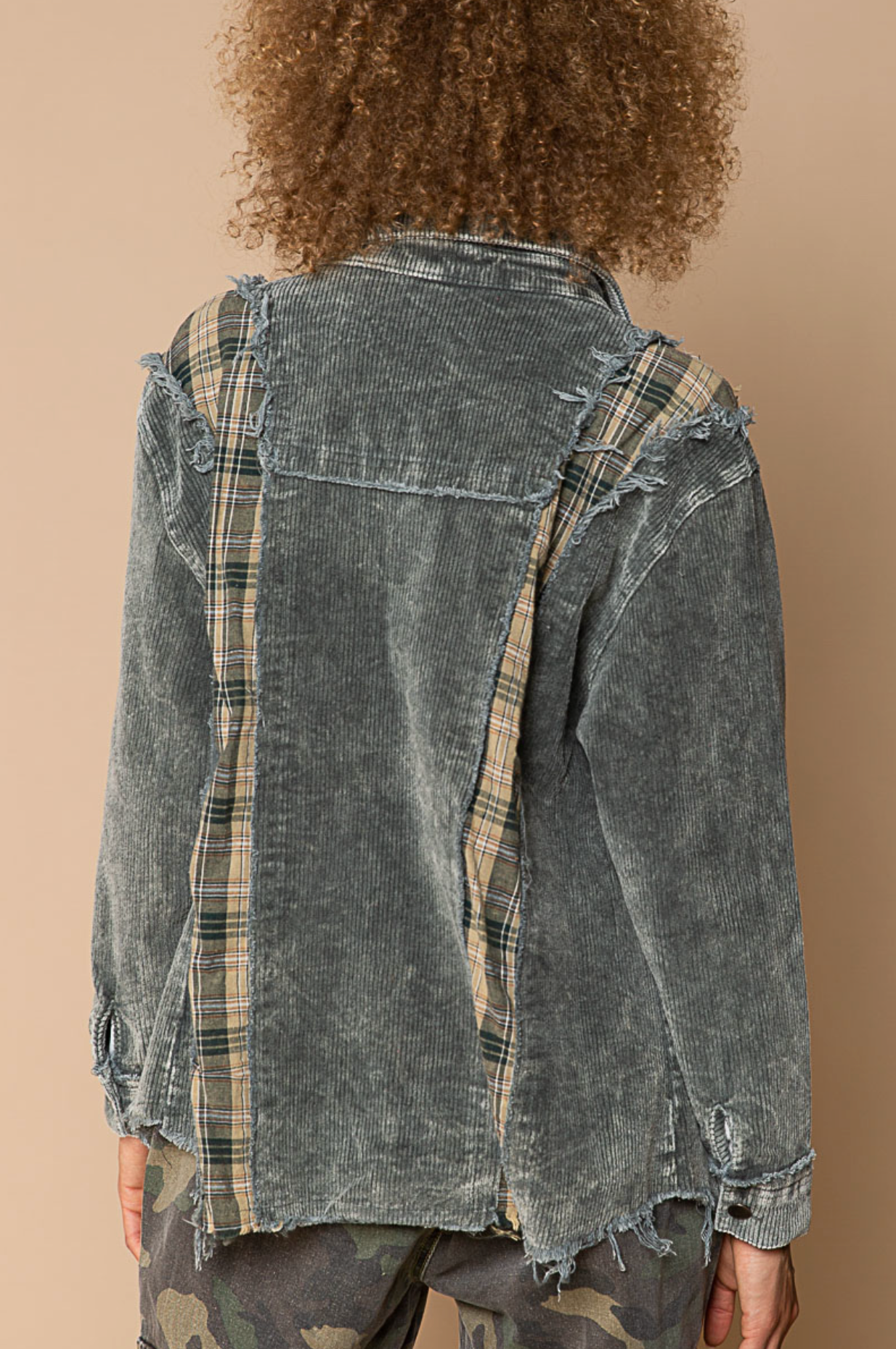 Corduroy shacket in burnt sienna with a raw edge, front pockets and a plaid insert detail. Fall colors and a unique casual look with jeans.
