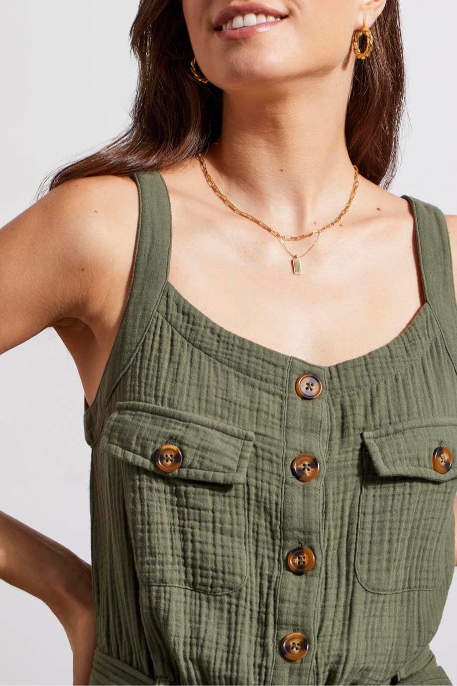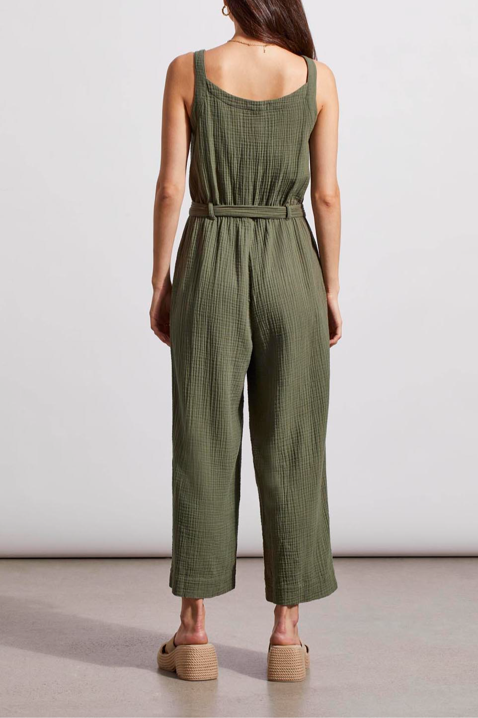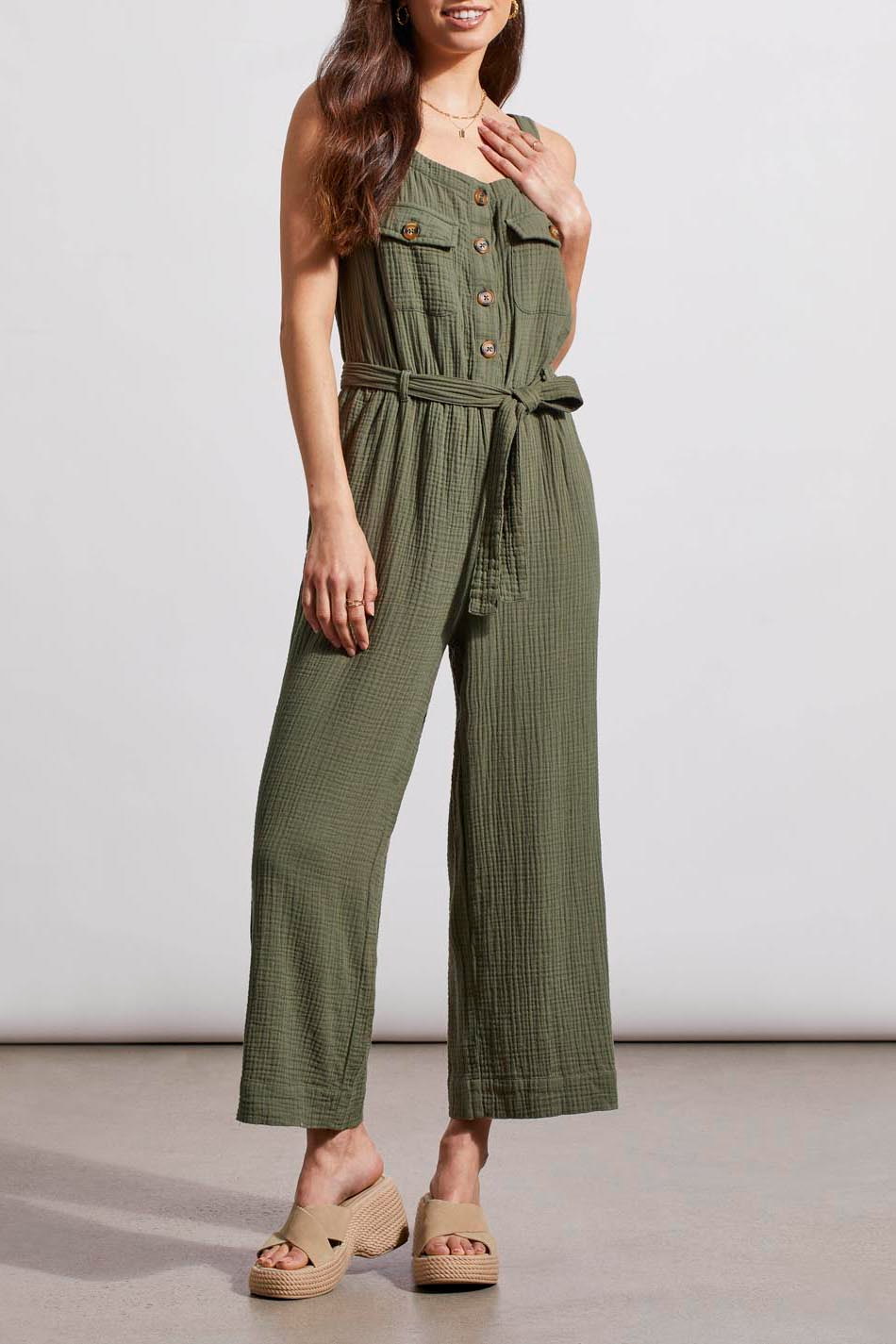 Flowy, soft jumpsuit. Figure flattering belted look, sleeveless for warm weather. Pair with sneakers or sandals.