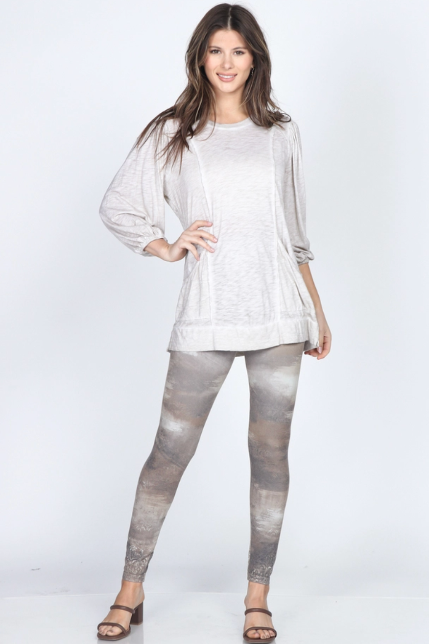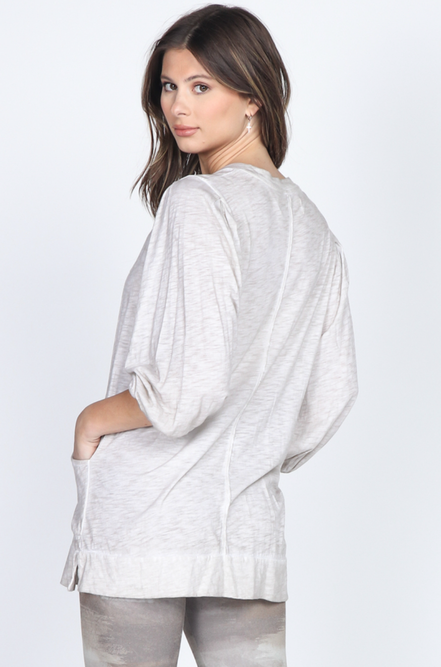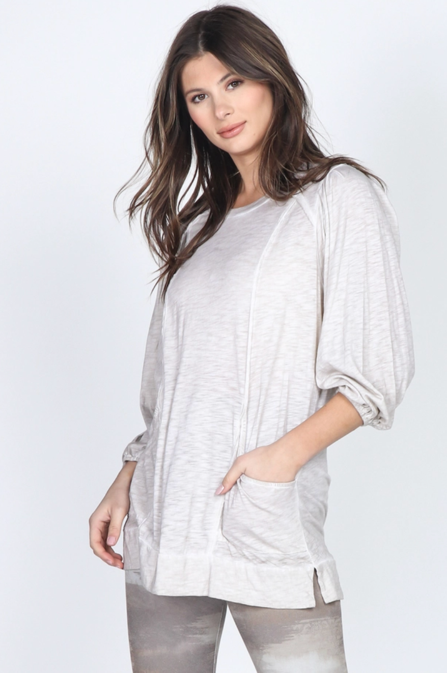 This cotton-modal blend tee is super buttery soft. Features slub knit textures, puff sleeves, a tunic silhouette and pockets!