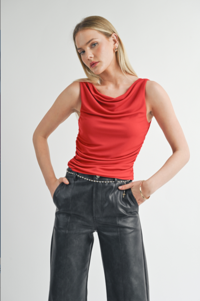 Cowl neck top with side ruching and drape back neckline. Beautiful red color that's perfect for the holidays or a night out.