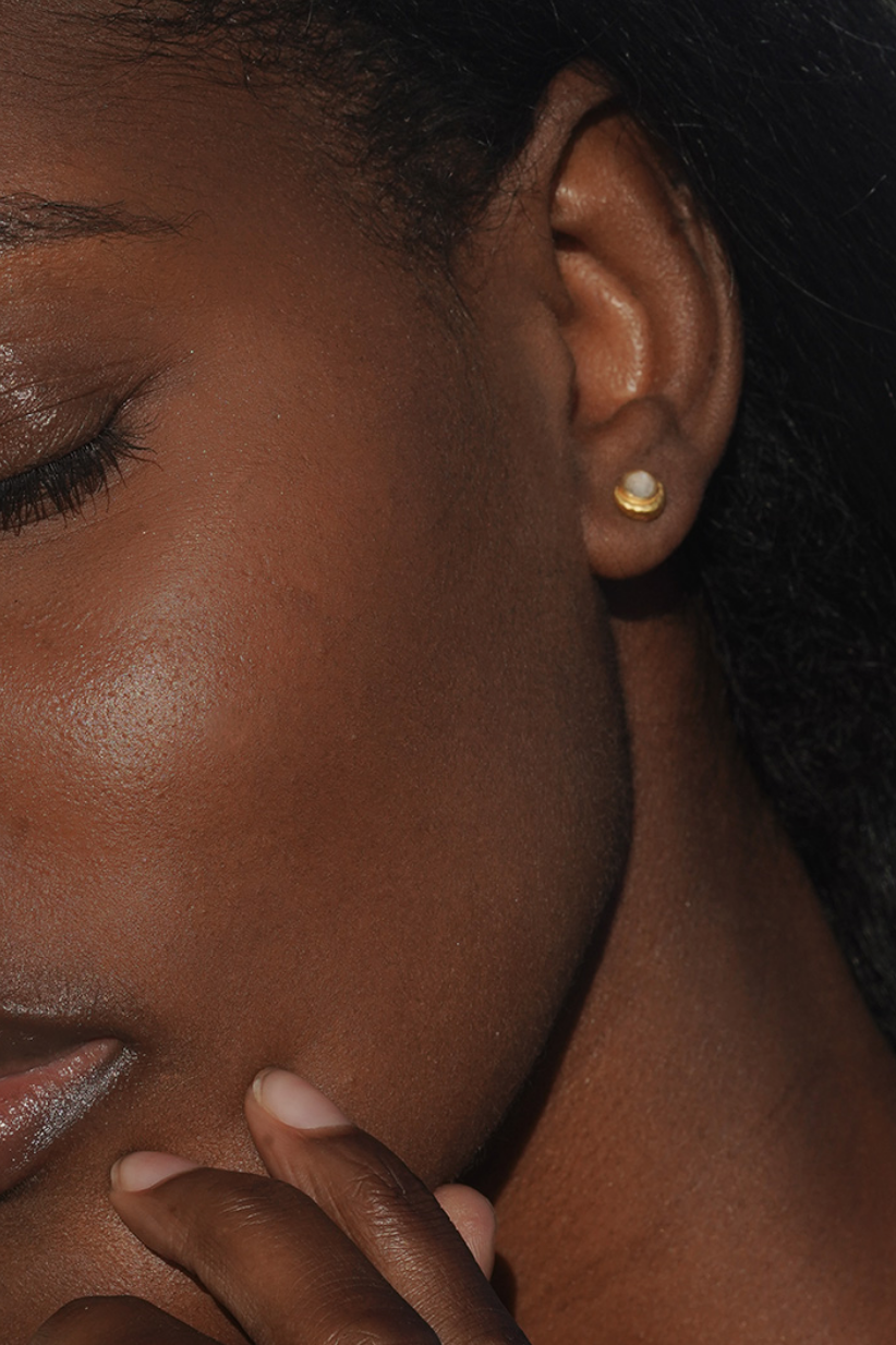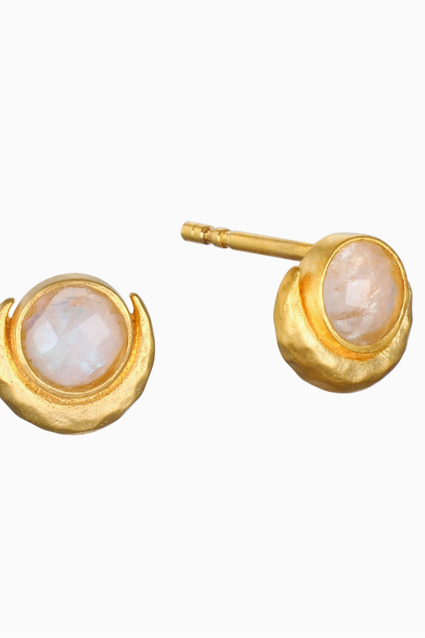 The goddess moon appears nightly to cradle us in her light; as we embark on our journey to authentic connection, we are held in her protective embrace. Gleaming 18kt gold plated crescent moon earrings hold luminous orbs of moonstone, stone of passion, intuition, and good fortune. Wear these celestial stud earrings as a reminder that the moon--symbol of the goddess, nourishment, and protection--is a guiding hand on your path to truth.