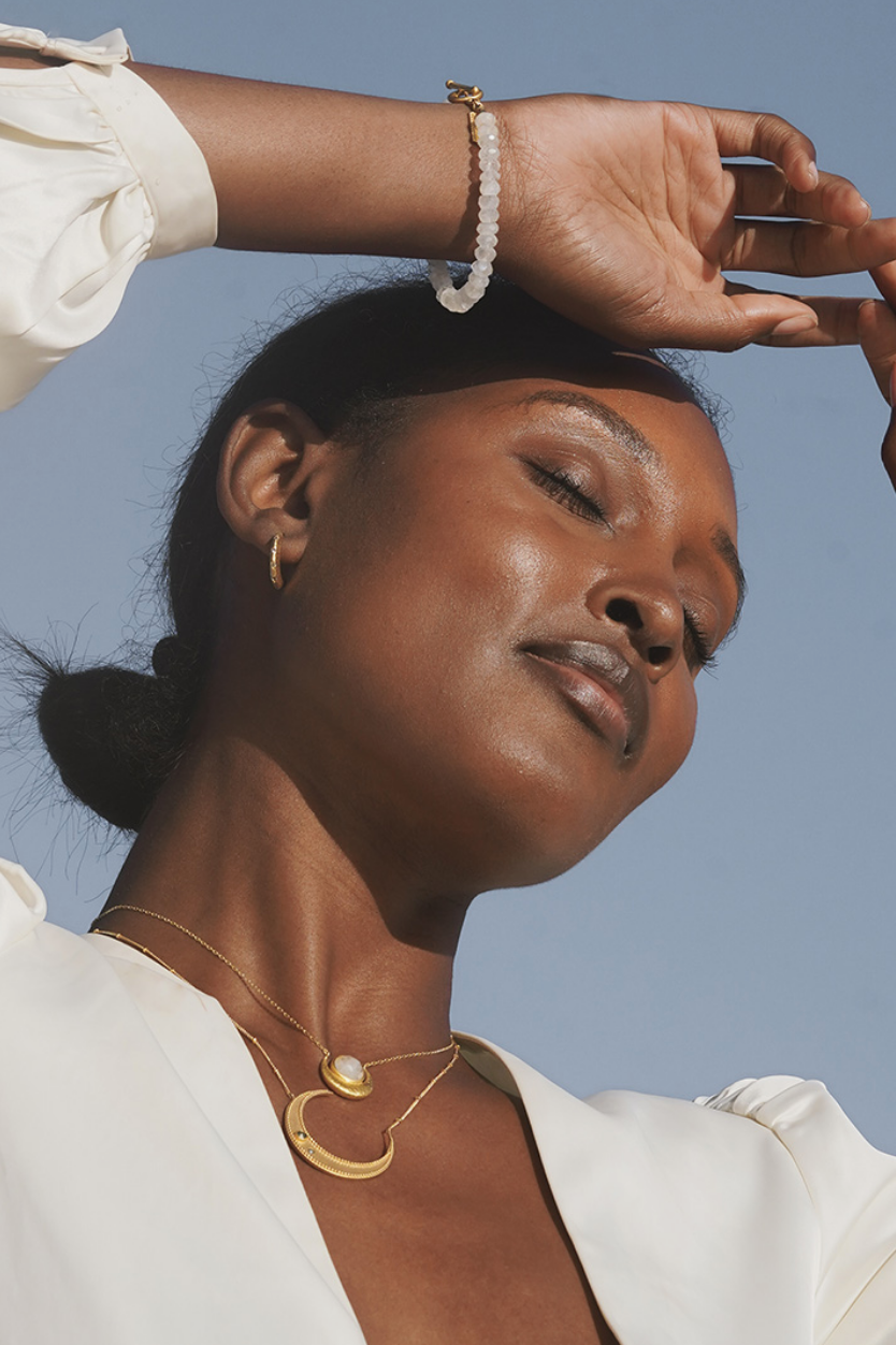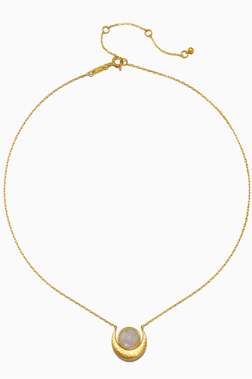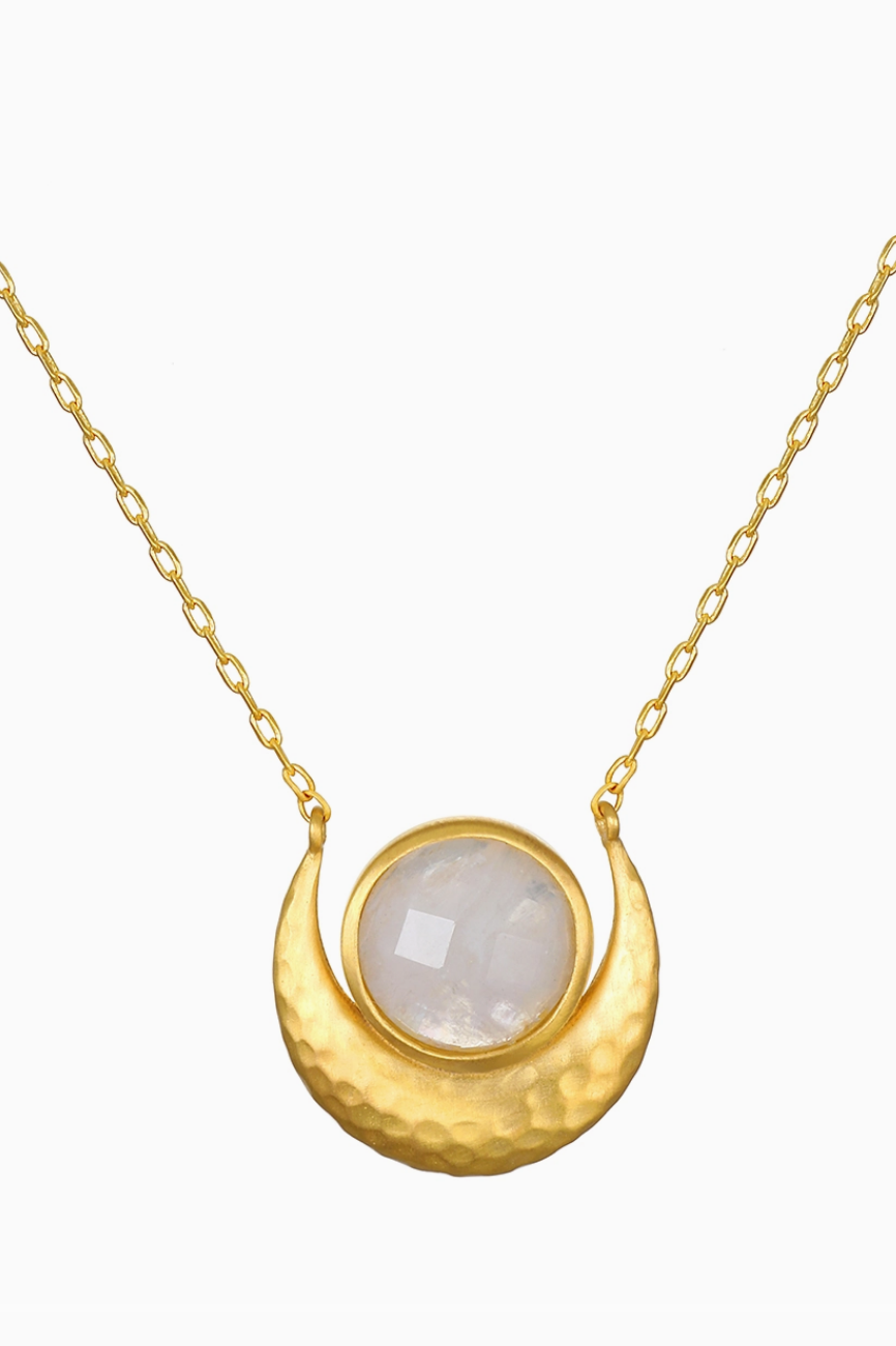 The goddess moon appears nightly to cradle us in her light; as we embark on our journey to authentic connection, we are held in her protective embrace. A gleaming 18kt gold plated crescent moon holds a luminous orb of moonstone, stone of passion, intuition, and good fortune. Wear this celestial necklace as a reminder that the moon--symbol of the goddess, nourishment, and protection--is a guiding hand on your path to truth.