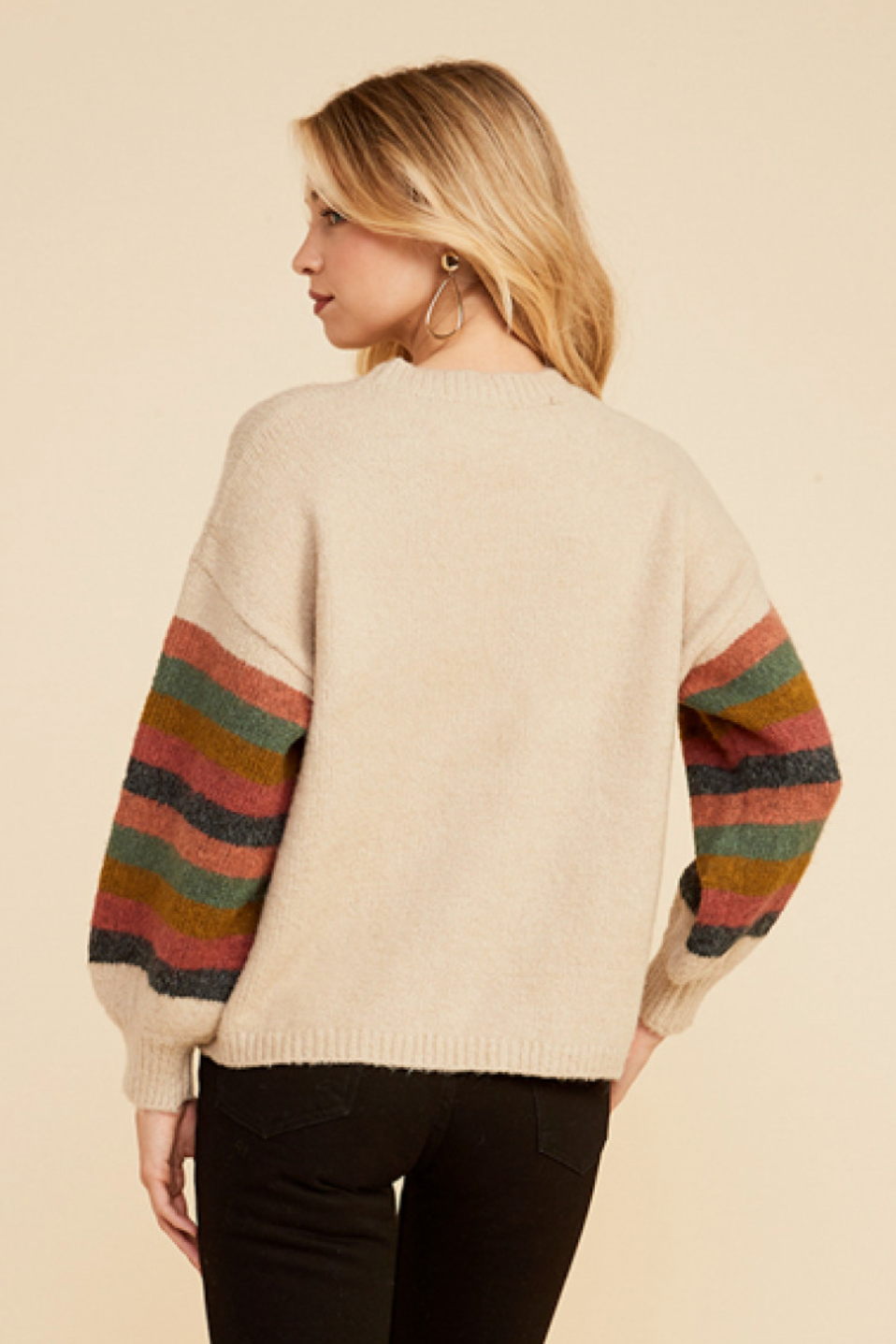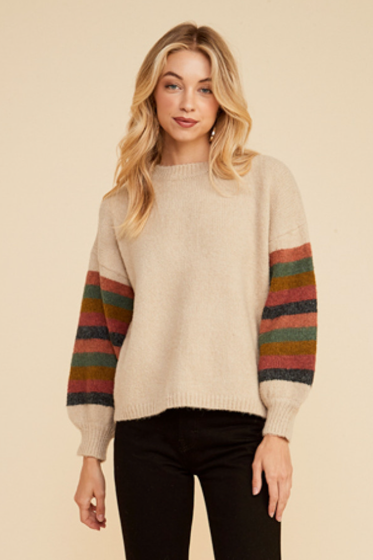 Balloon sleeves are a great trendy detail for fall. The crew neck sweater is a twist on the basic sweater with the color block sleeves. Looks great with a dark wash bottom.