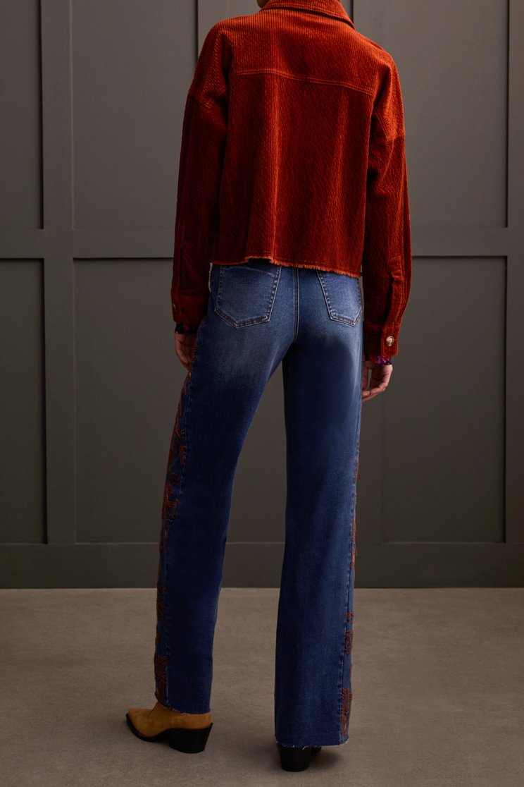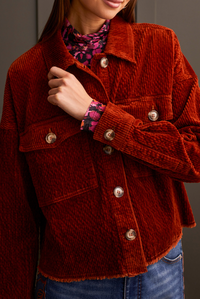 Crop soft corduroy jacket with raw edged hem in pumpkin spice. Great for fall!