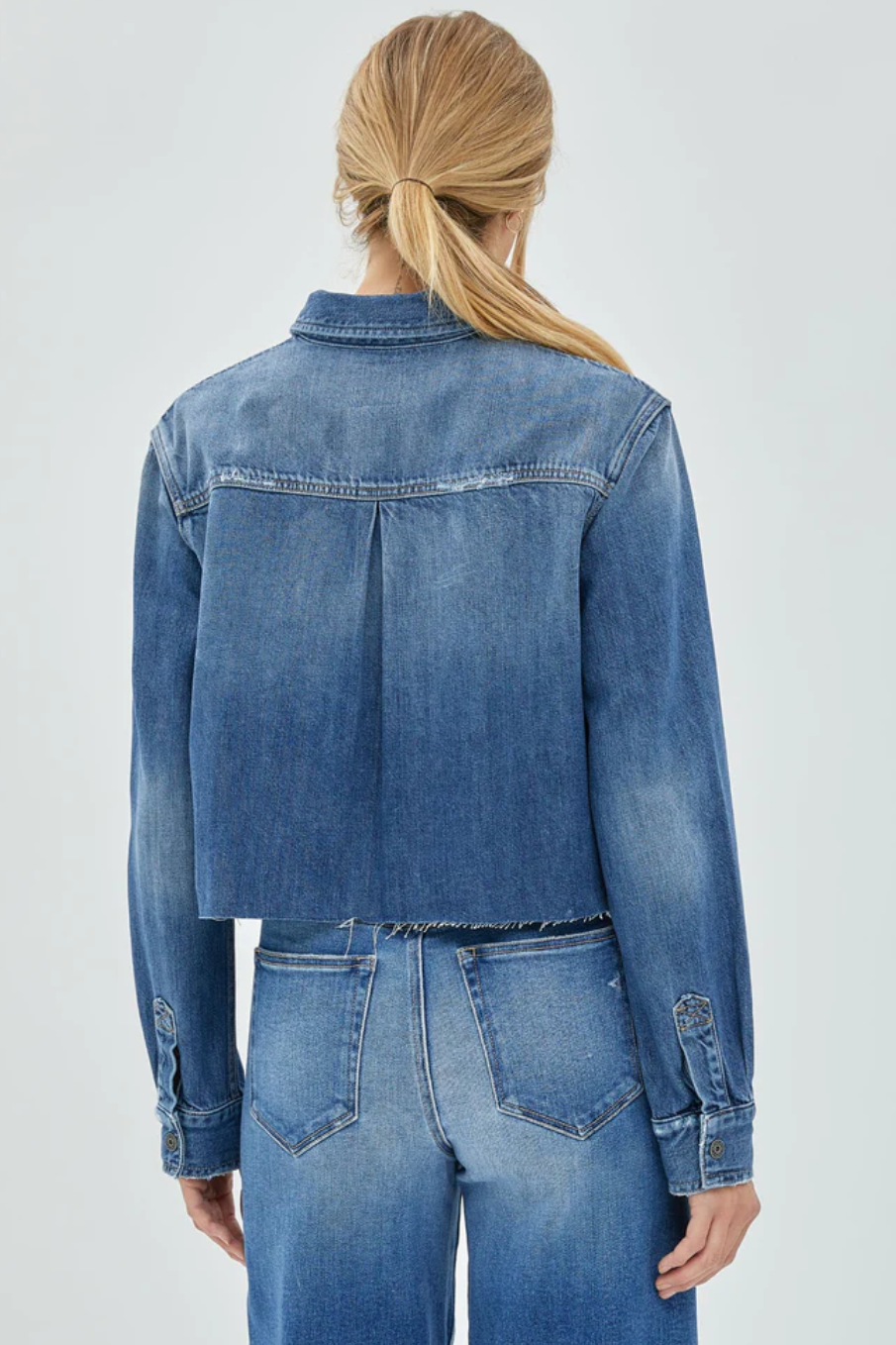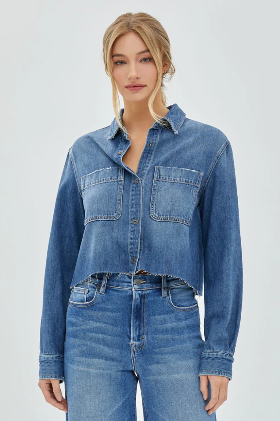 This cropped denim shirt is great for a casual outfit. The shirt has a button down closure, along with pockets on the front.