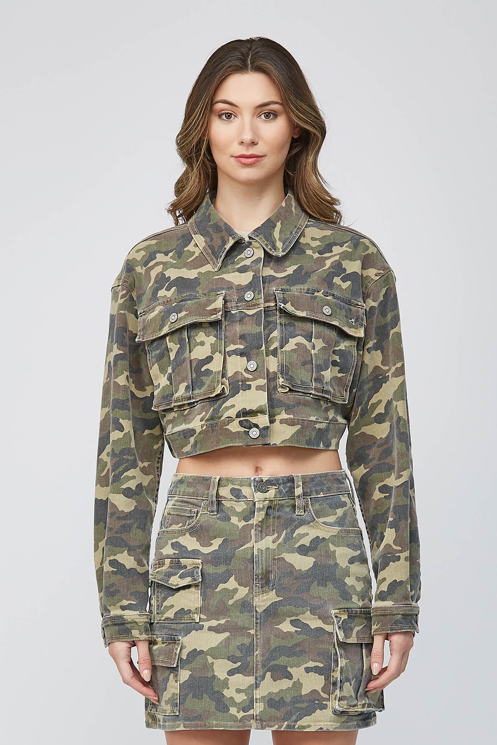 Camo cargo cropped jacket. This jacket can be worn all year and paired from matching camo bottoms to plain denim.