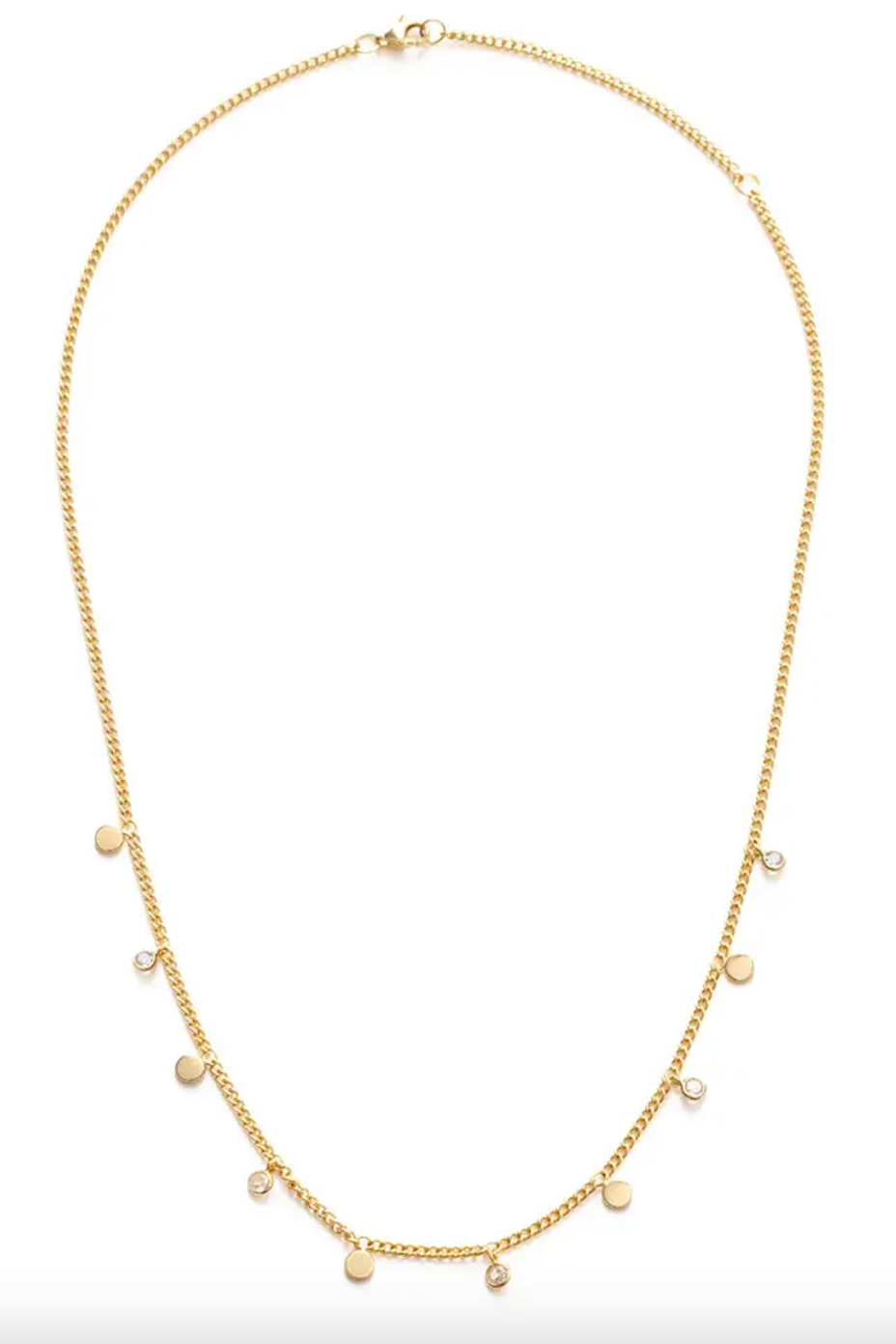 Tiny disks and crystals create a swag of glints of light. This piece layers with anything and is lovely all on its own. 18" in length.