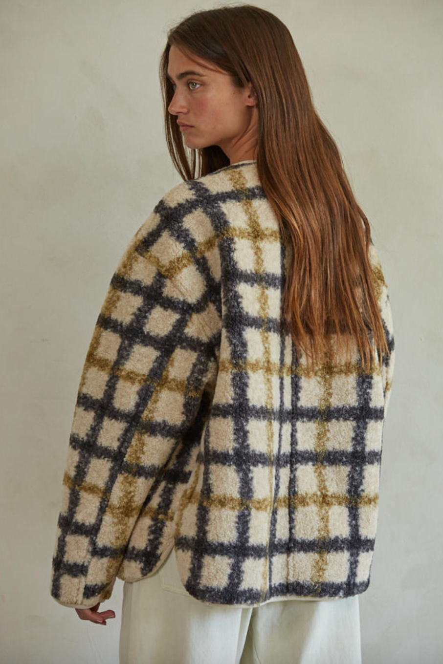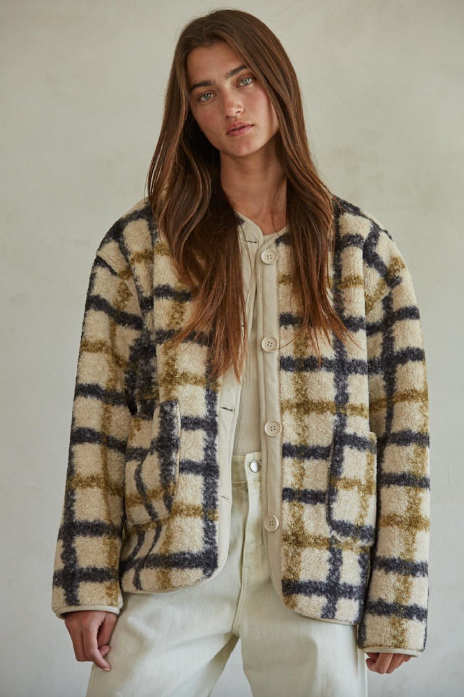 Woven Polyester Plaid Fleece Button Down Round Neck Long Sleeve Jacket With Pockets