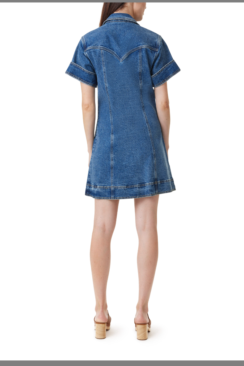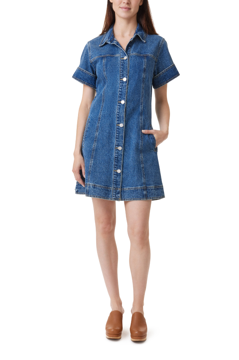 Short sleeve denim shift dress with button front, seam detail throughout and western style seaming on the back. A versatile piece that can be worn as a dress or a jacket.