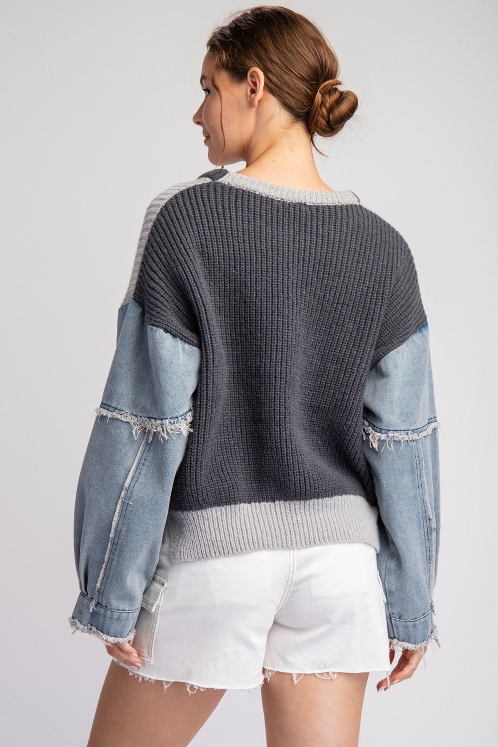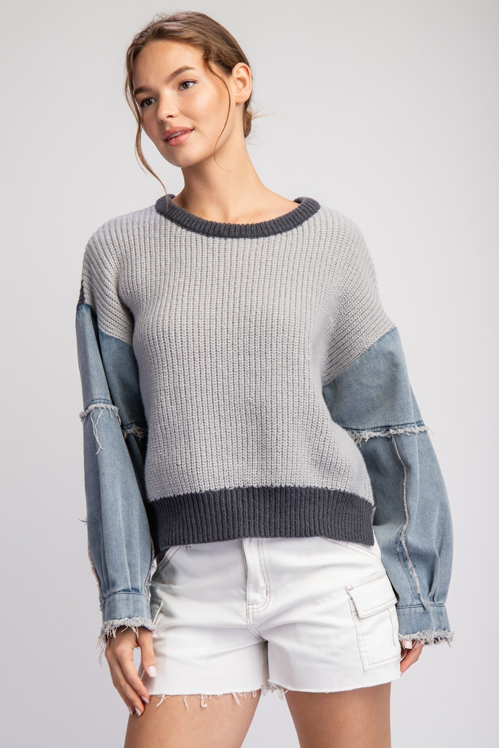 Wear this sweater with an added denim element! The Denim Sleeve Sweater has a two toned round neckline, dropped shoulders, and denim sleeves with added fray detailing.