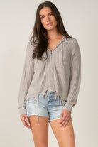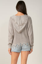 This zip-up sweater has a great distressed bottom. It looks great worn casually with a basic tank and leggings or with jeans.