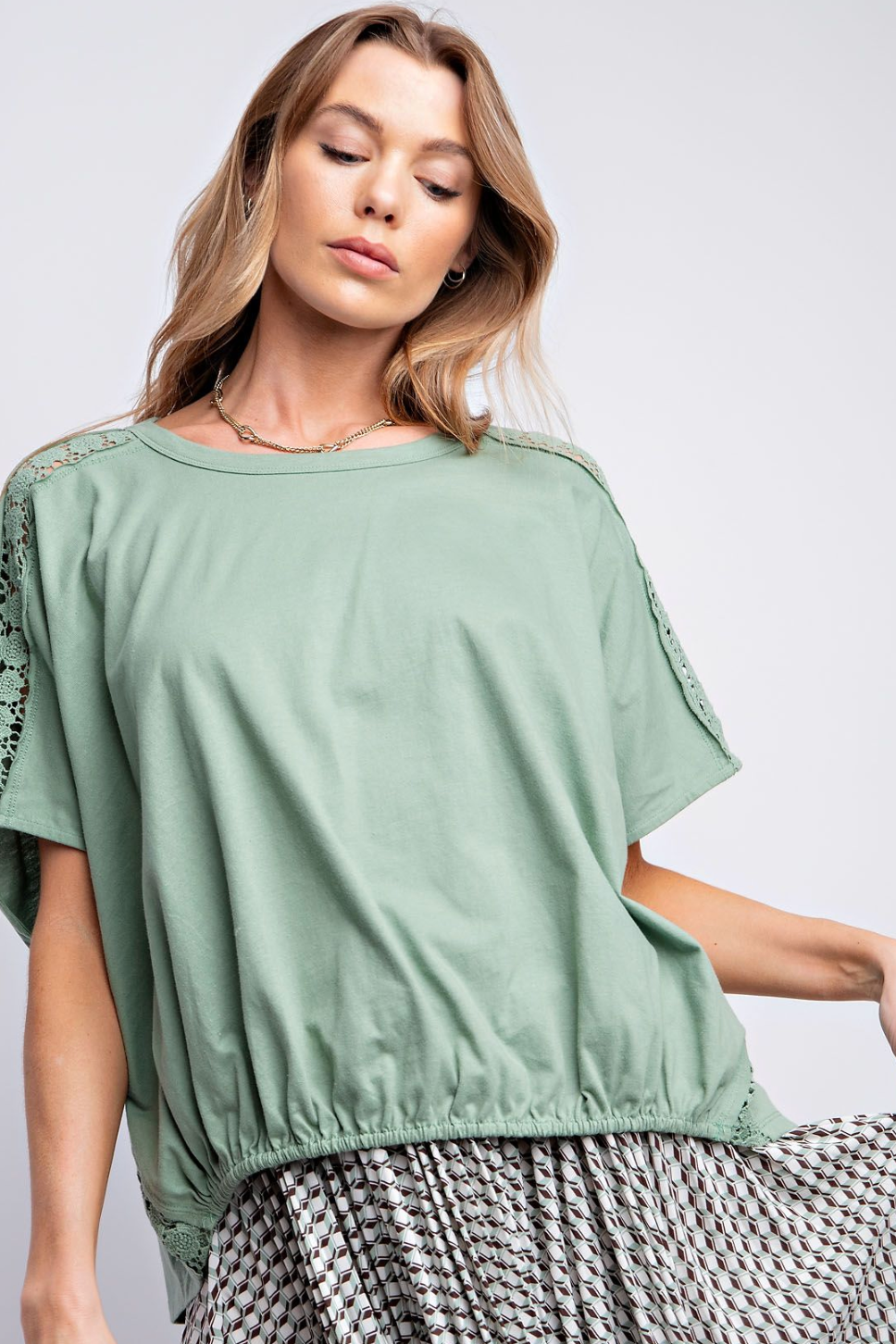This top has a loose fit, with lace detailing on the sleeves. The bottom of the top has a elastic bottom, allowing for stretch. Complete this look with jeans or a maxi skirt to achieve a boho style.