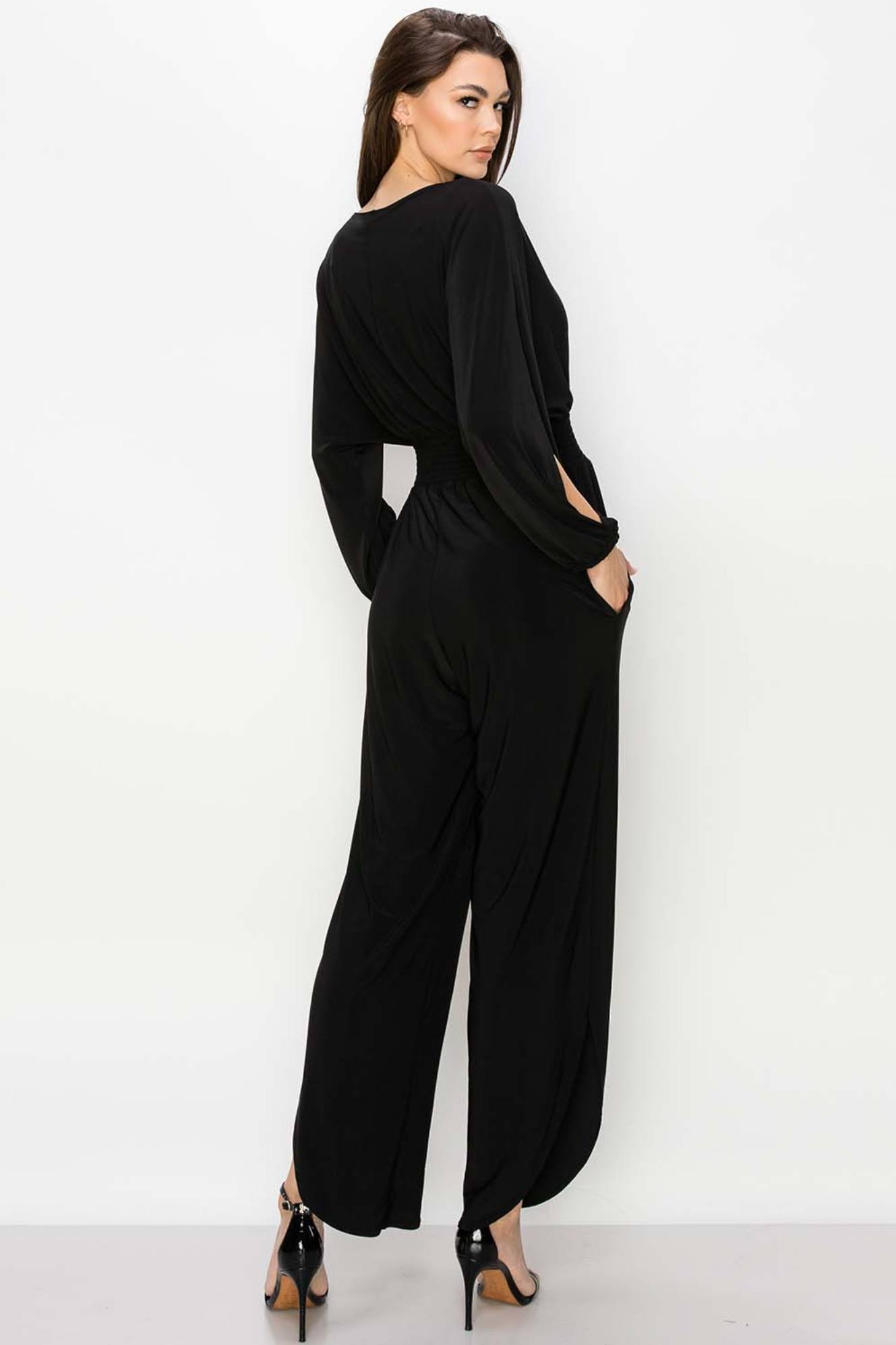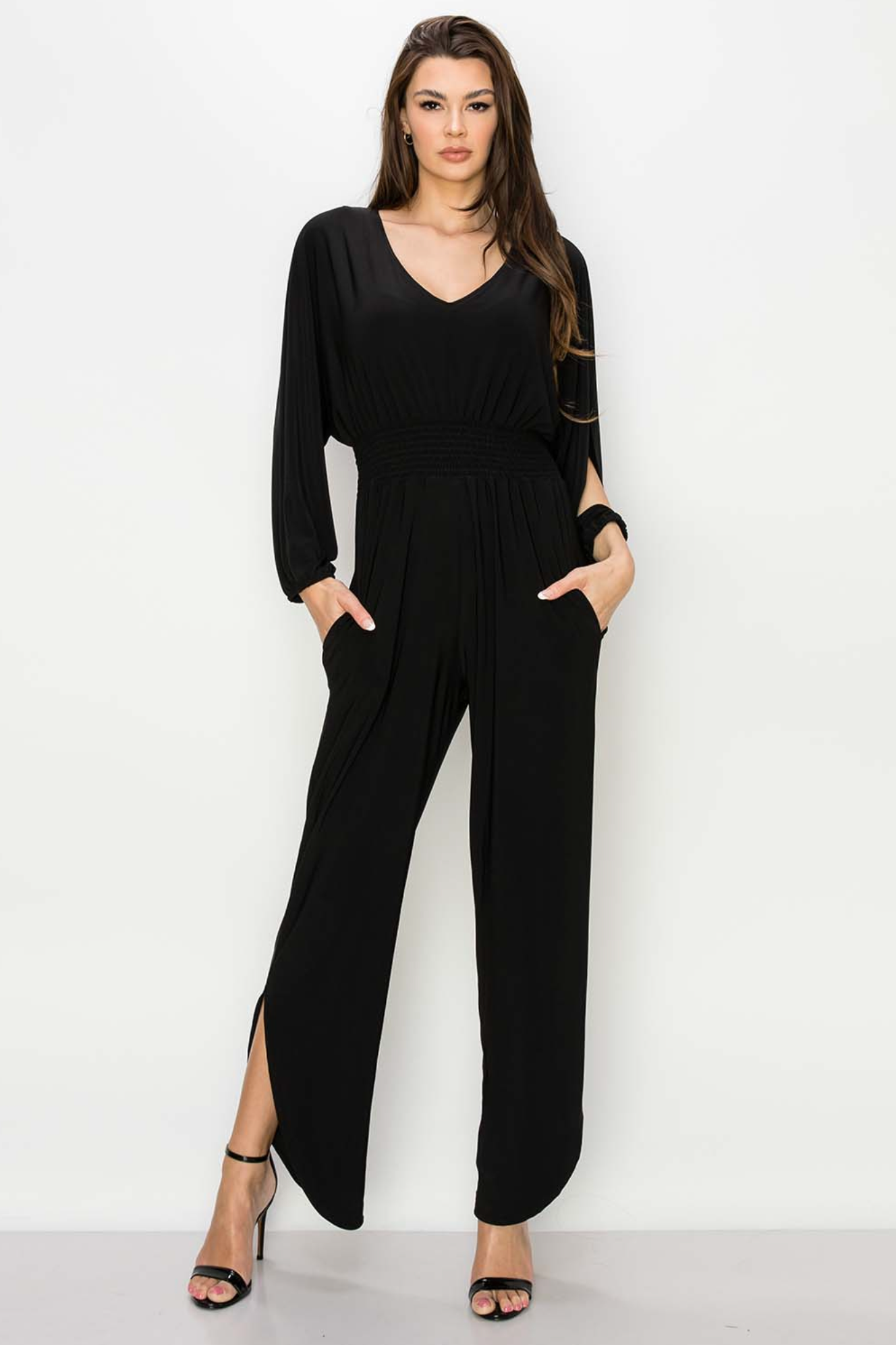 This jumpsuit speaks for itself with slits in the sleeve and on the ankles to show some skin and shirring on the waist for a slimmer look. It makes a statement all on its own while being a sexy, beautiful jumpsuit in the most courteous way. This jumpsuit fits right into a night of partying and fun!
