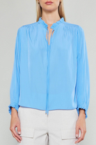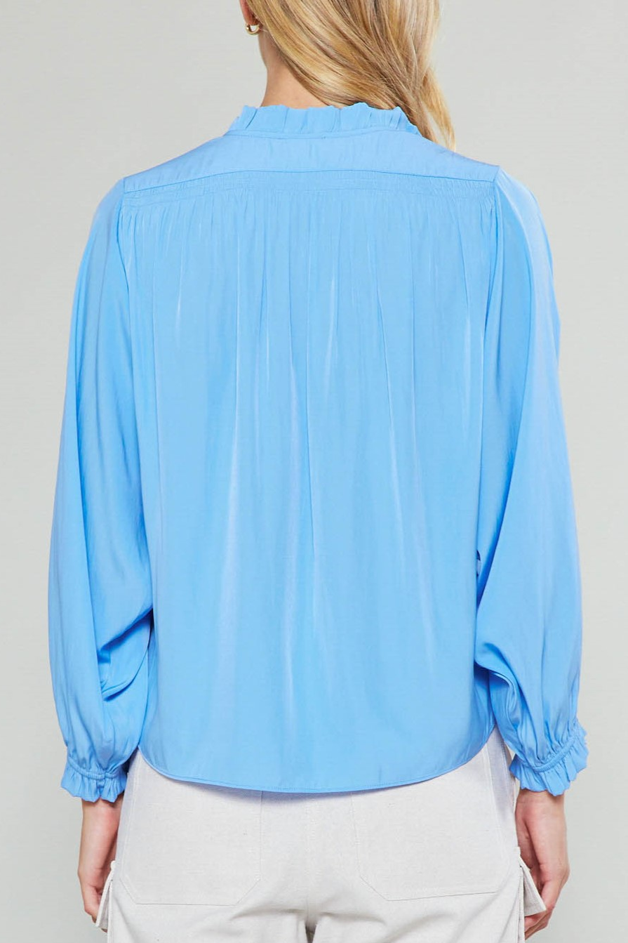 A floaty top in a color reminiscent of the summer sky. Relaxed and dreamy, the split-neck silhouette is enhanced by a number of pretty details—ruffle trim, self-tie neckline, dolman sleeves, and smocking to enhance the fabric's easy drape. "