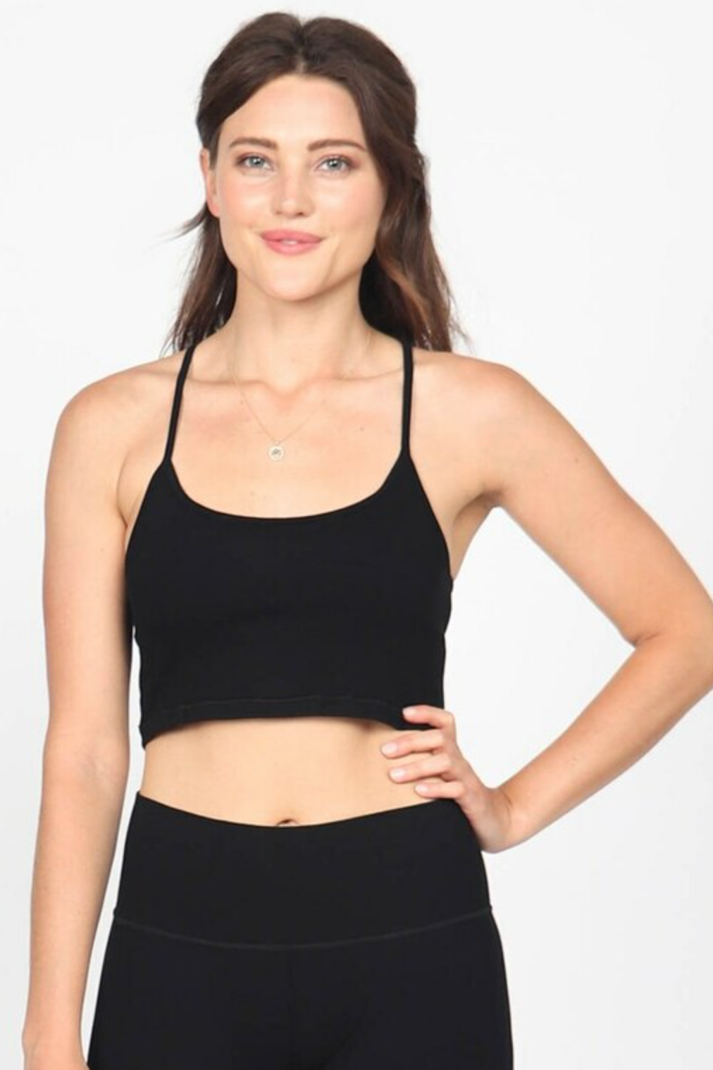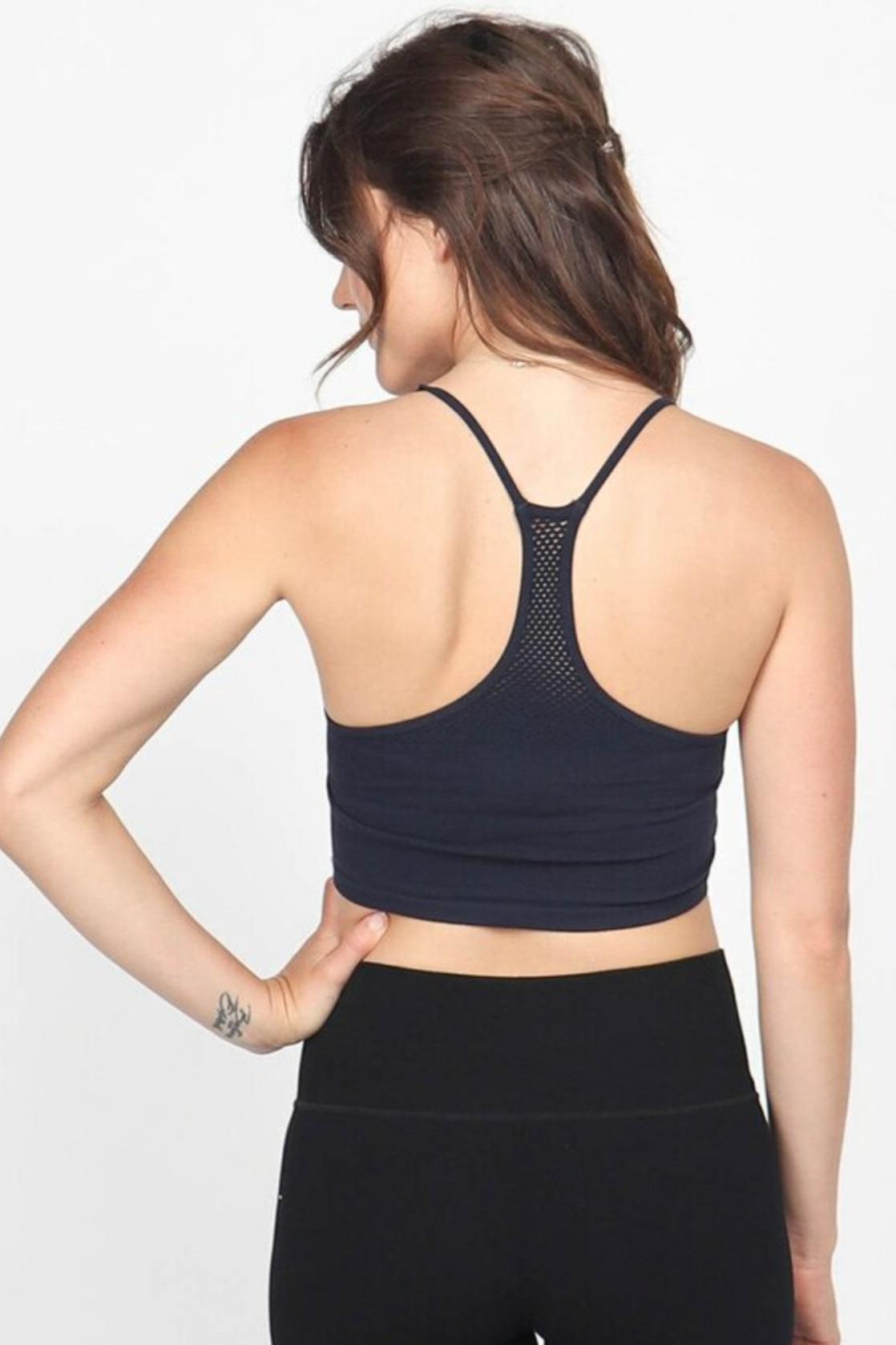 A durable and supportive bralette can be worn under a top or as a top during the Summer. The bralette has a double rib layer and a mesh racerback detail.