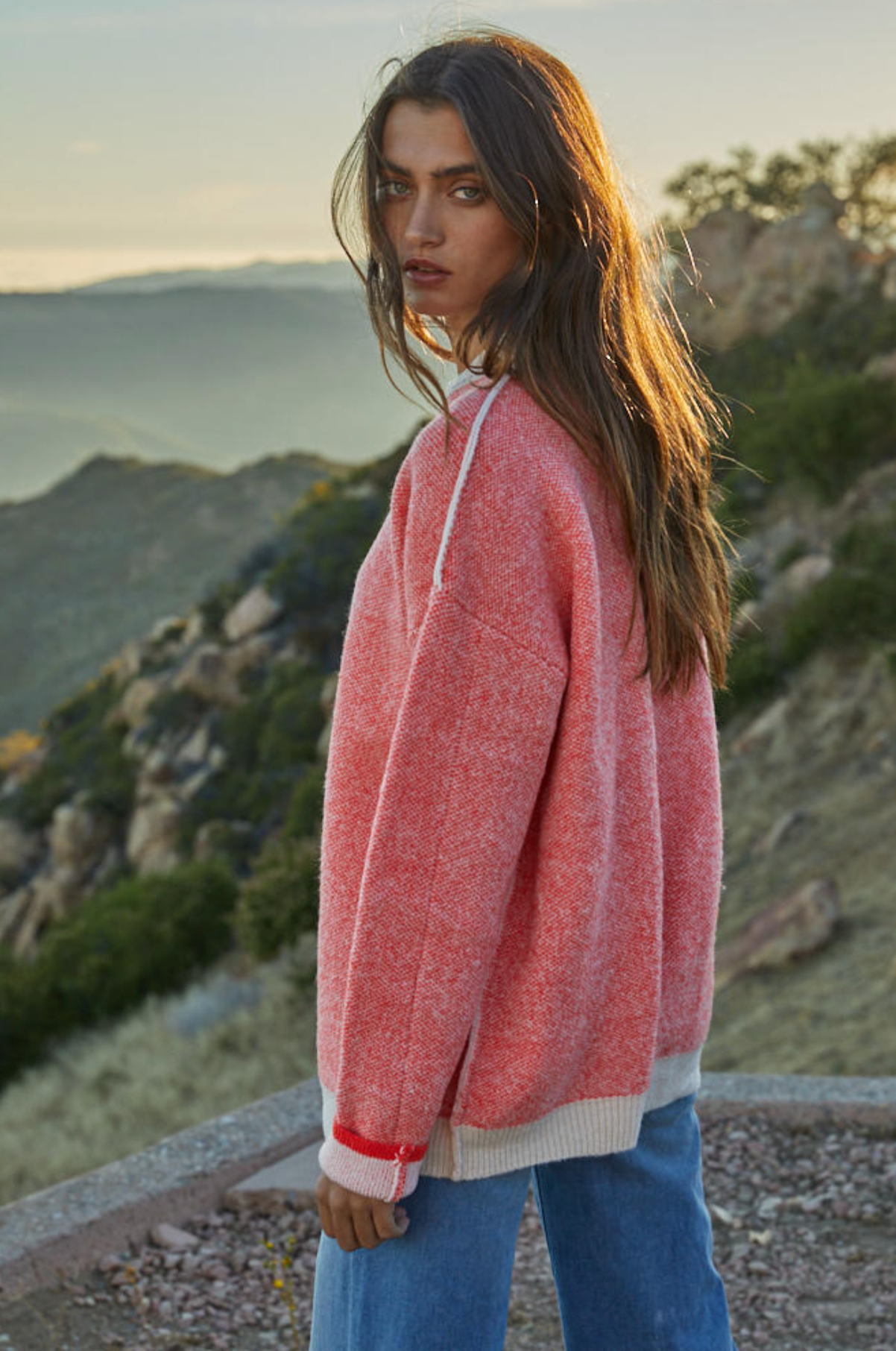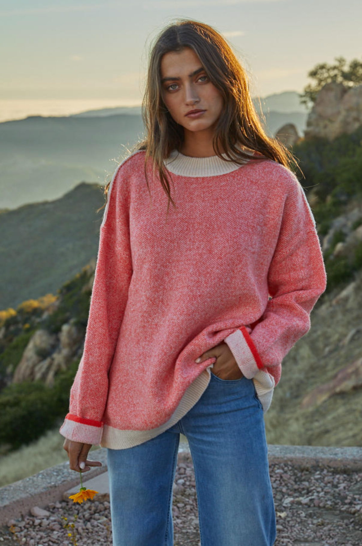 This oversized crew neck sweater is a great pop of color. Looks great with a light and medium washed denim and sneakers for a casual look.