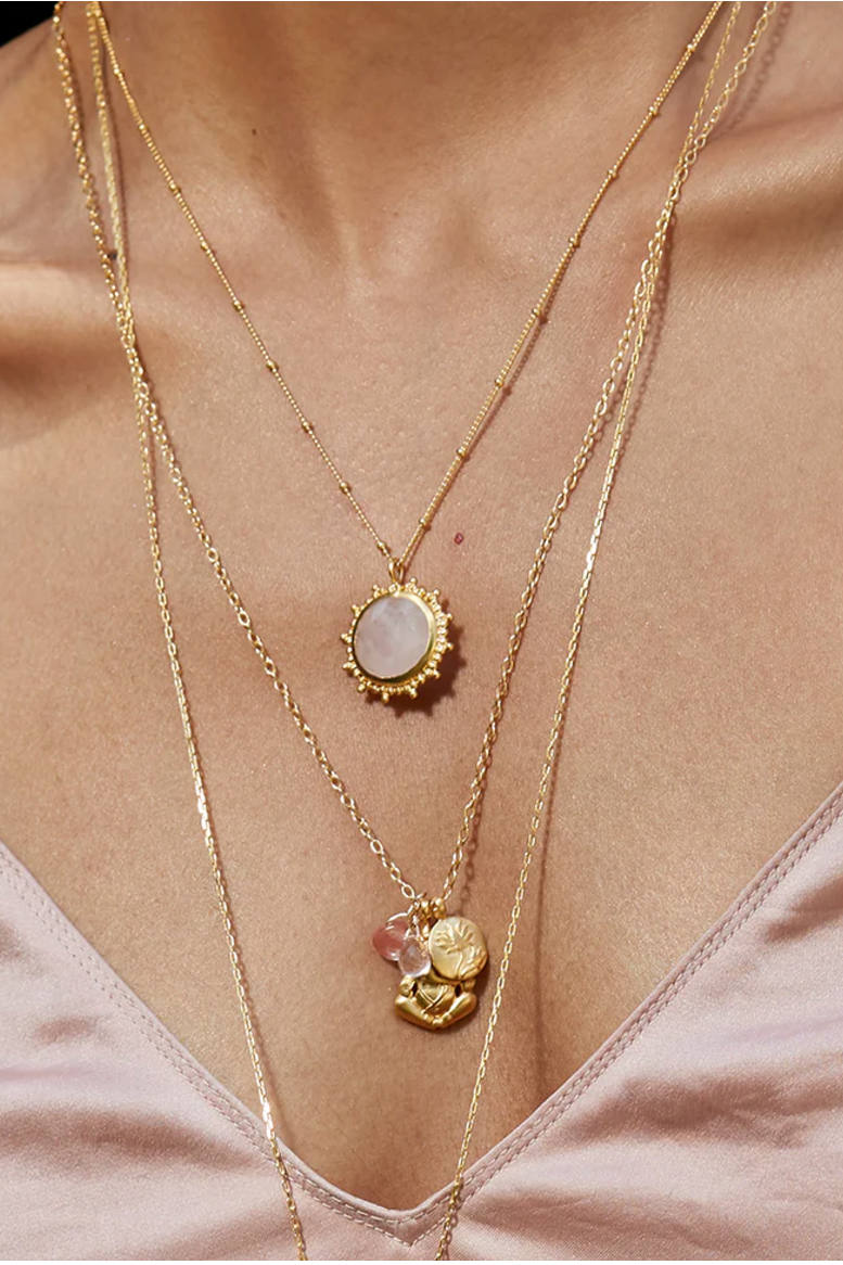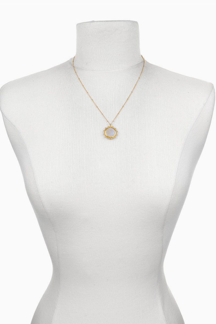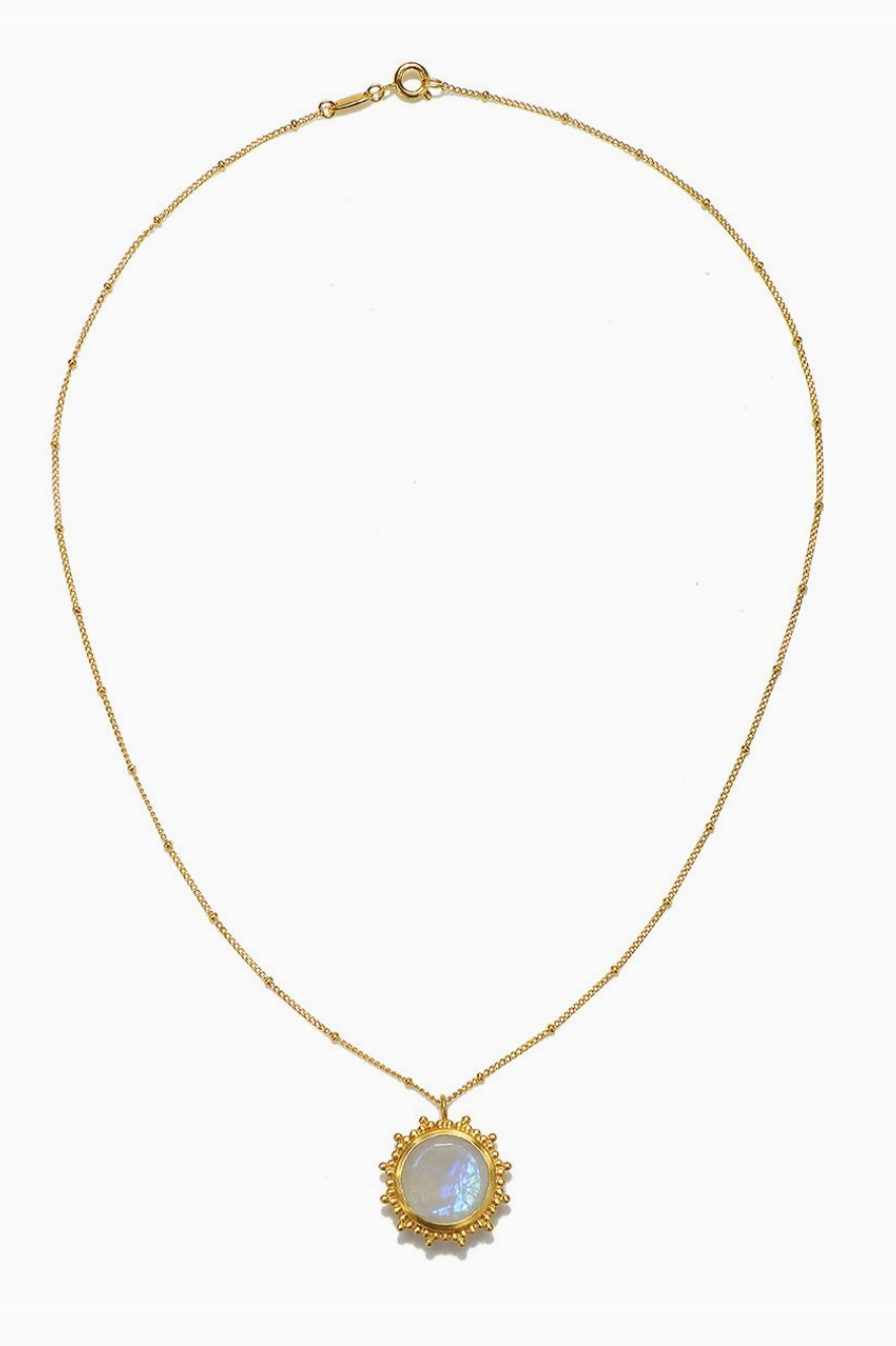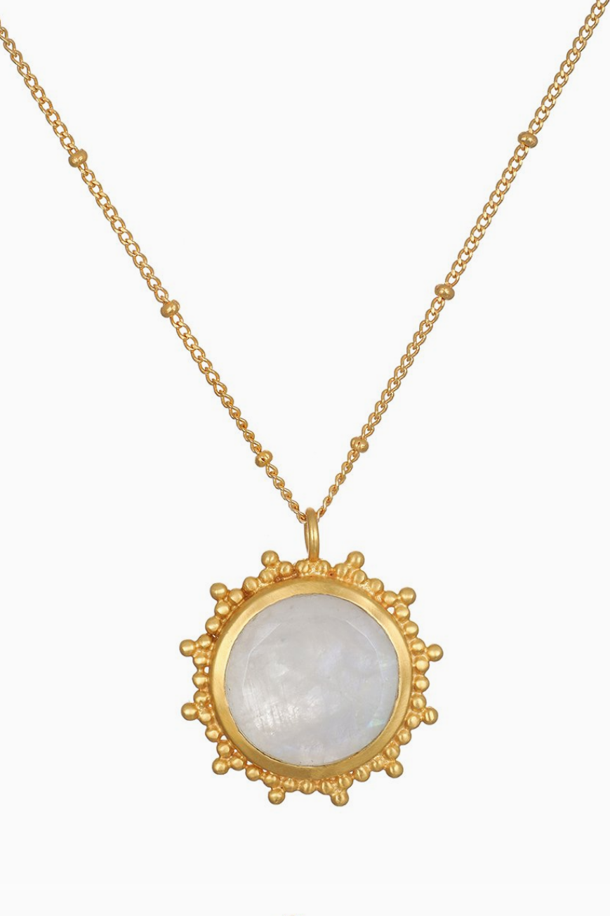 Allow your mind to wander; in daydreams, creativity reveals itself. A stunning moonstone pendant - stone of intuition, passion and good fortune - is surrounded by a beaded starburst design in gleaming 18kt gold plate for an eye-catching, inspiring necklace.
