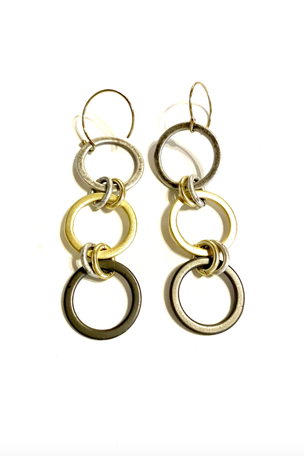 Mixed Metal earrings with three different metal circles. Can be worn with anything and gives and edgy look.
