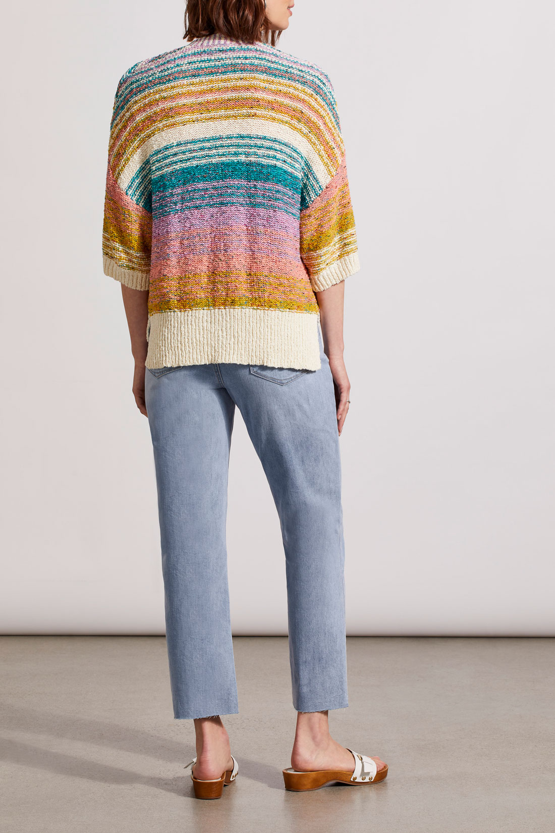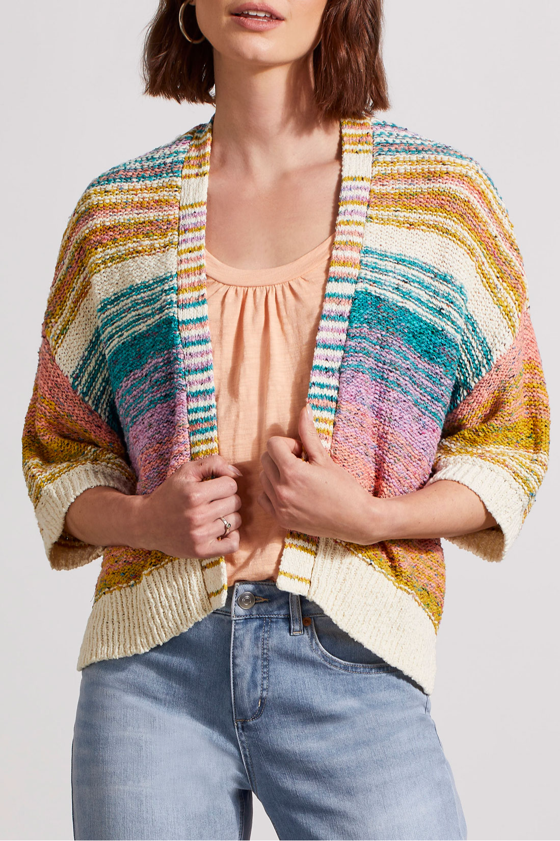 Looking for something colorful to wear? This cardigan is the perfect sweater to wear if you are looking for a pop of color in your outfit. This cardigan has 3/4 sleeves and an open front.
