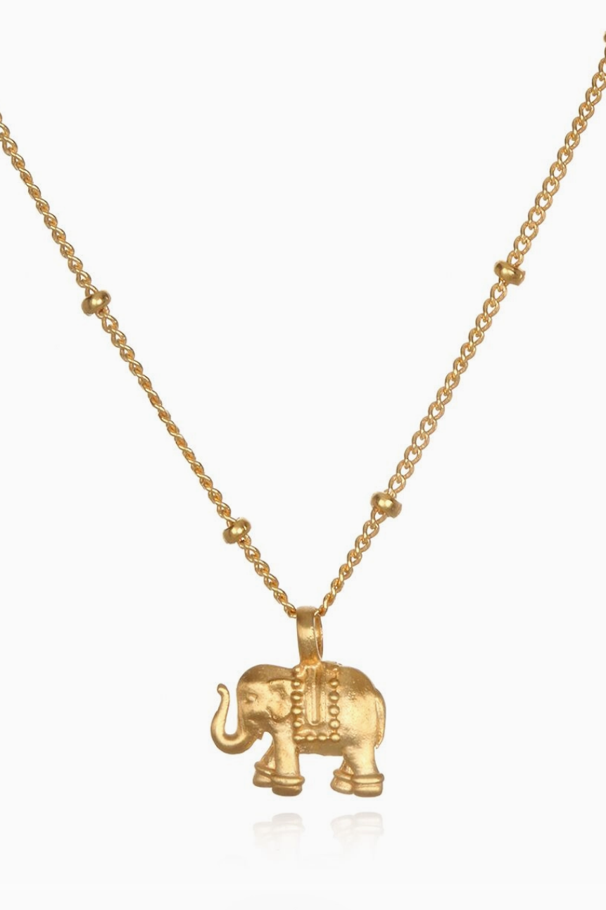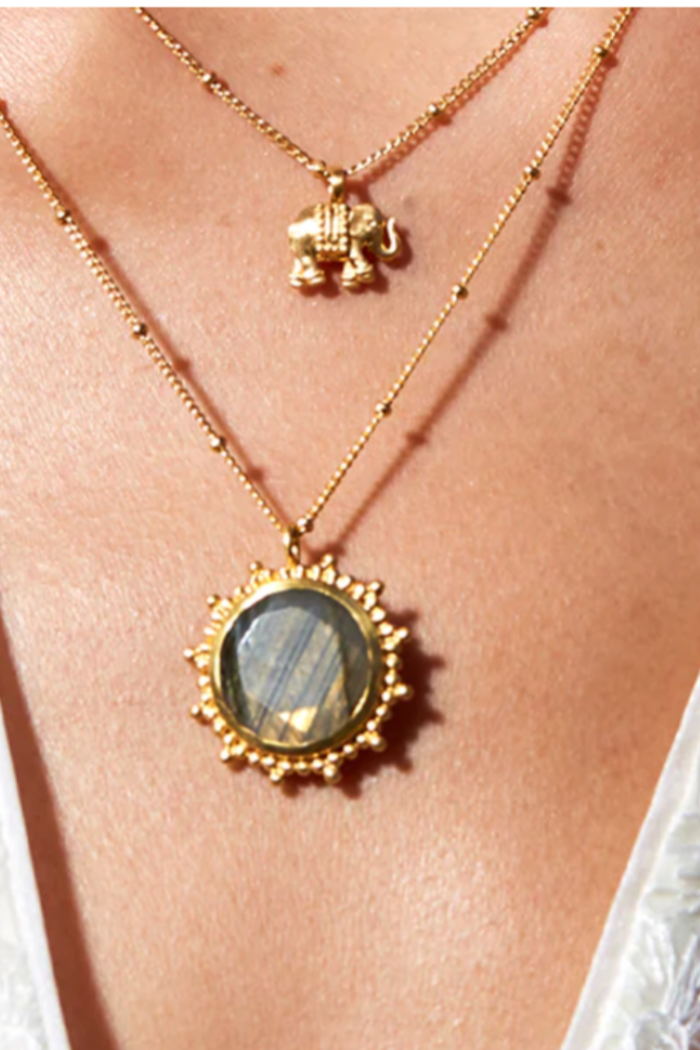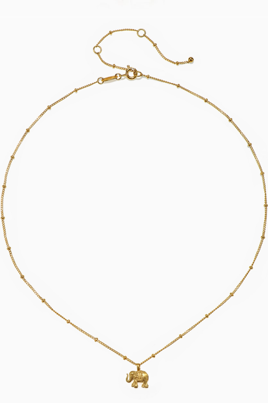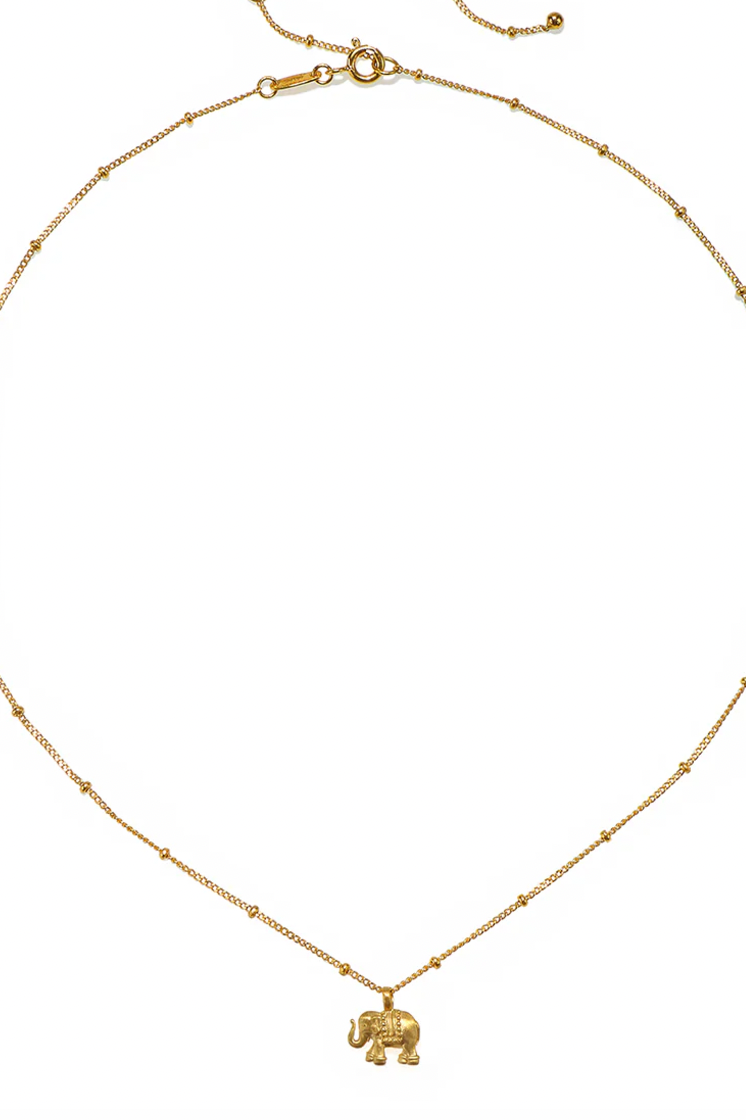 With gentle grace, we stand in strength for what we are called to uphold. From an 18k gold plate beaded necklace, an elephant pendant radiates its wisdom, strength and good fortune out into the world.