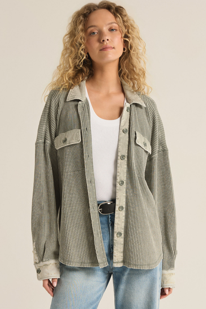Add the Elijah Waffle Jacket over an outfit to bring it all together! This jacket has a button front closure, chest pockets with flaps, a curved hem shape, and a regular fit.