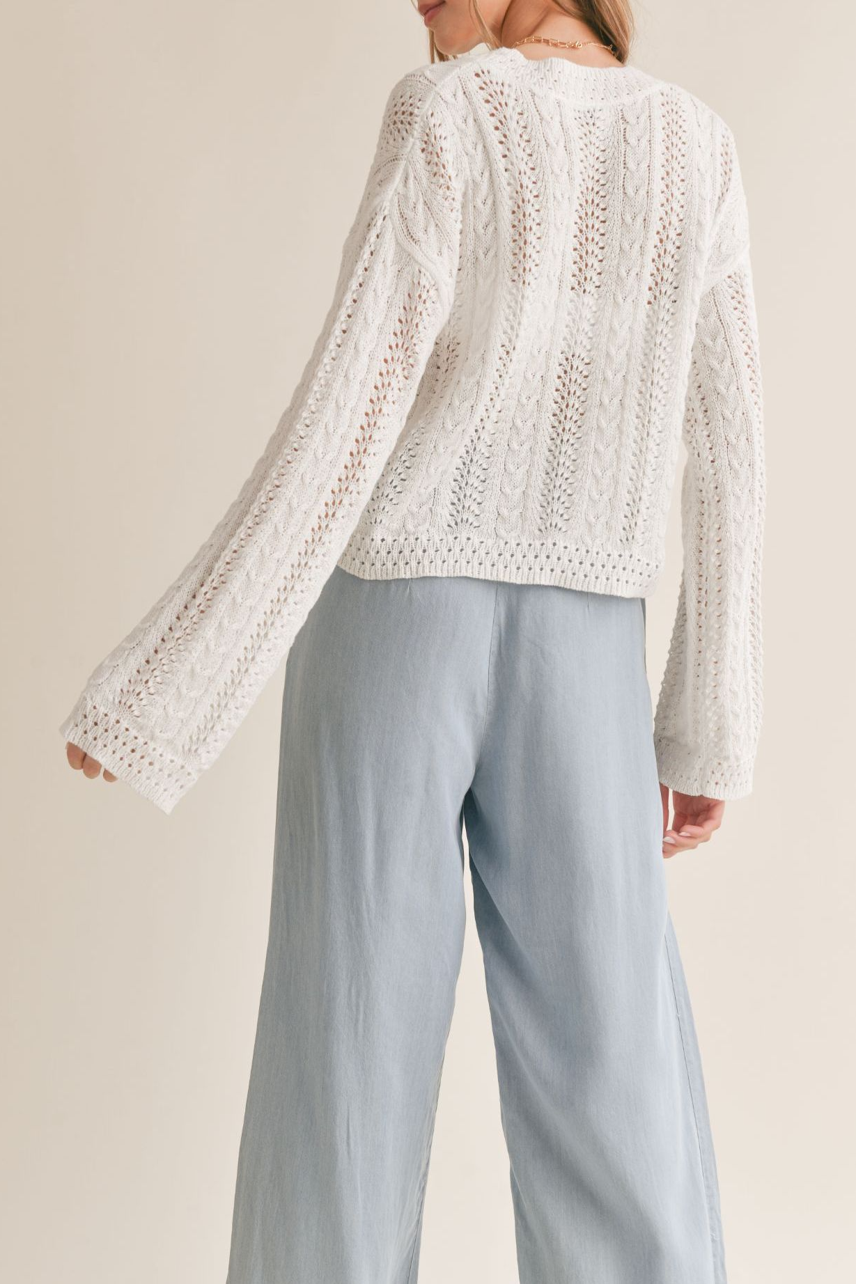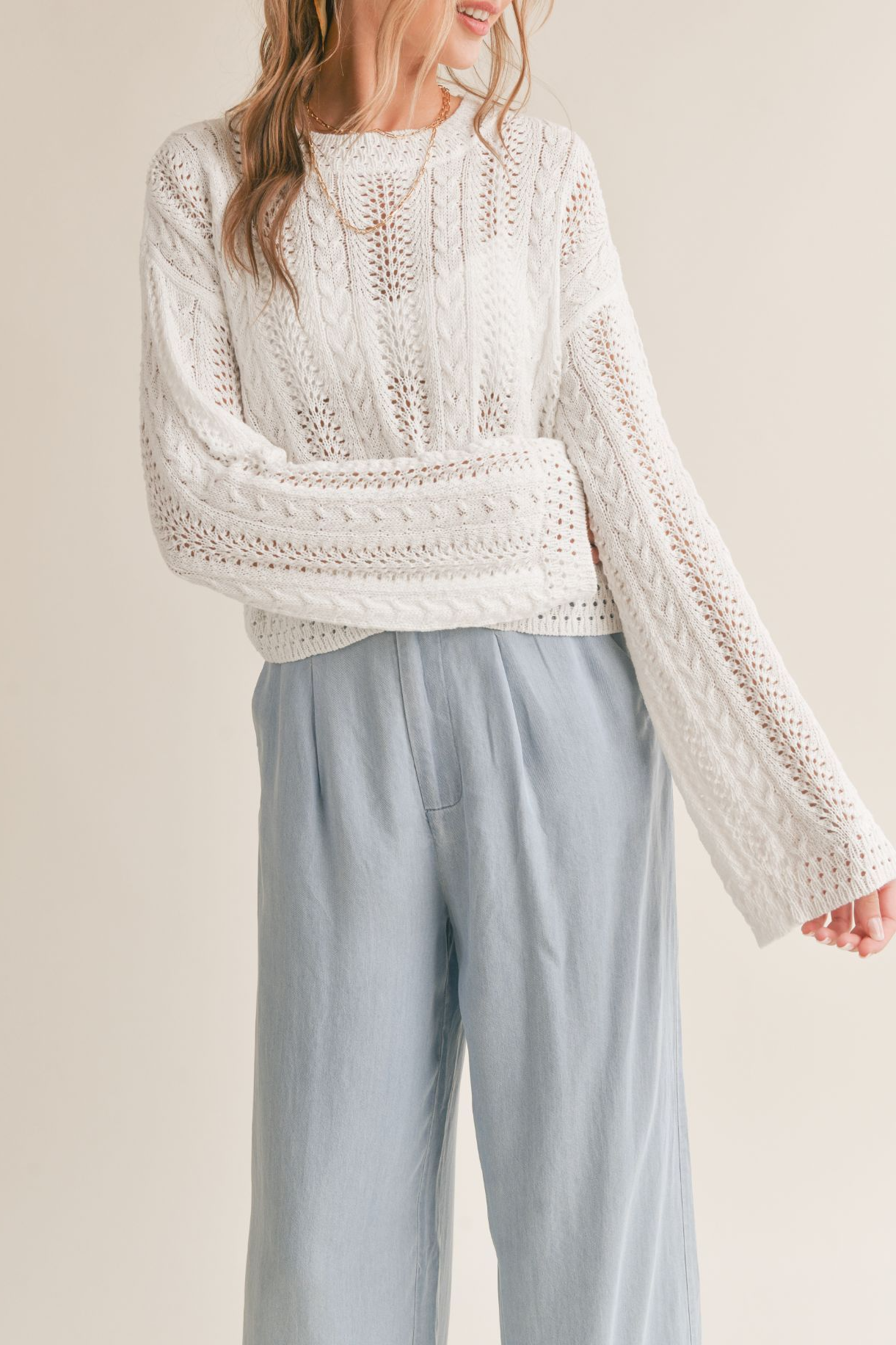 Wear this lightweight cable knit sweater on a cold summer night. The Ella Spring Cable Knit Sweater is great to pair with a skirt or pants.