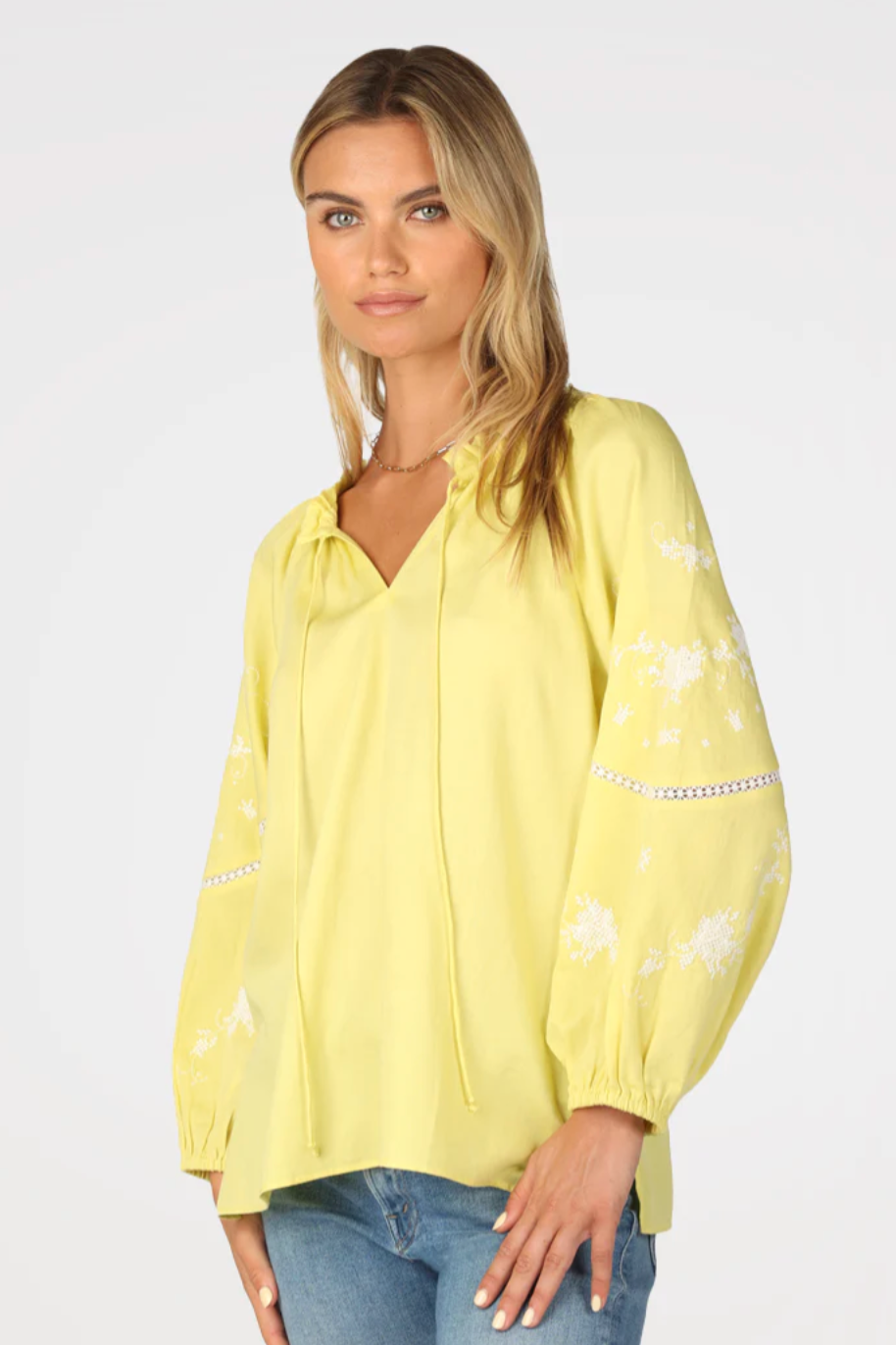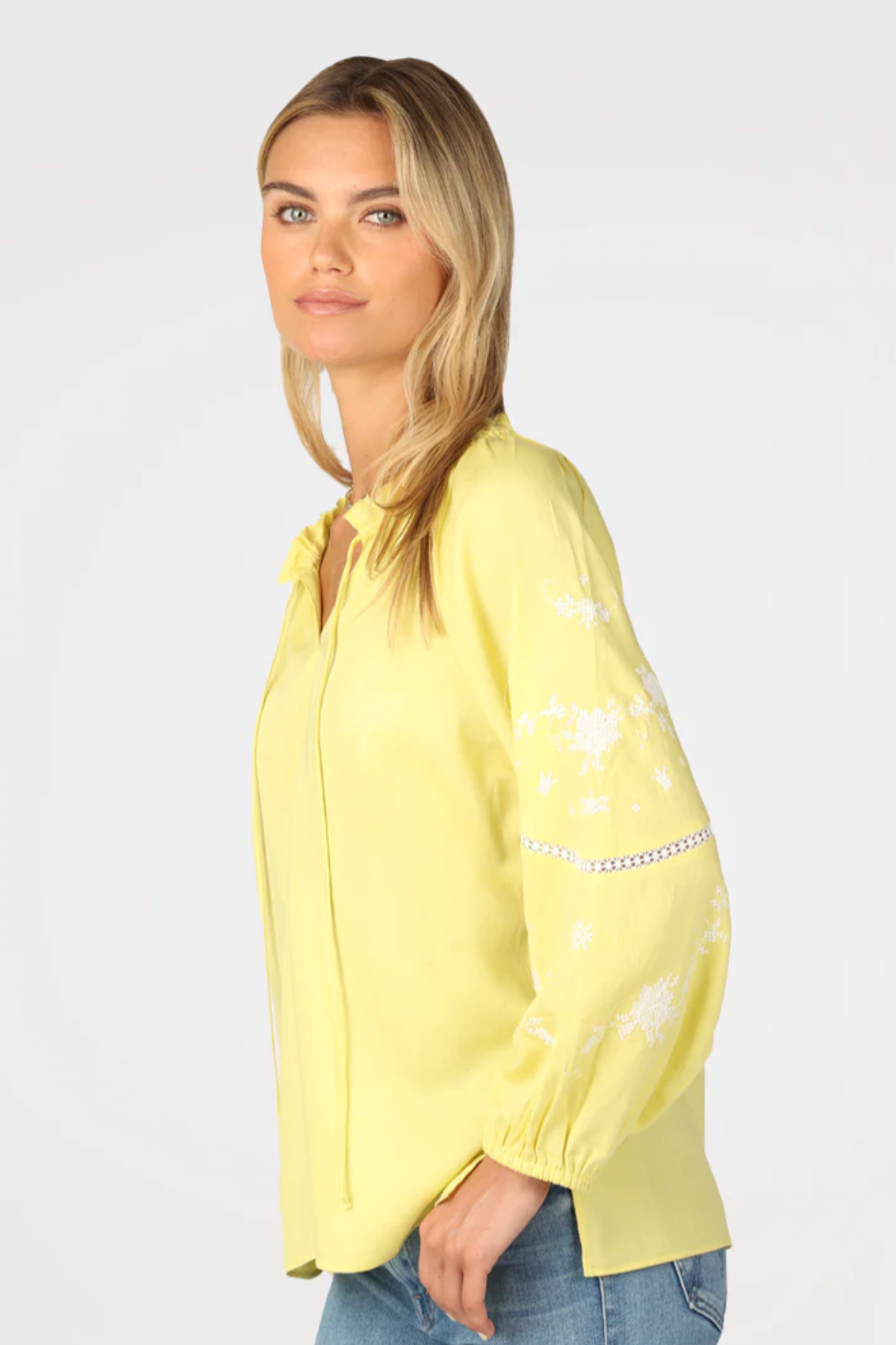 This light and airy blouse is the perfect addition to your summer closet! This blouse has a cross stitch floral design with a lace insert. Pair with jeans and sandals.