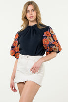 Embroidered puff sleeve top in navy and deep orange tones. Great fall top.