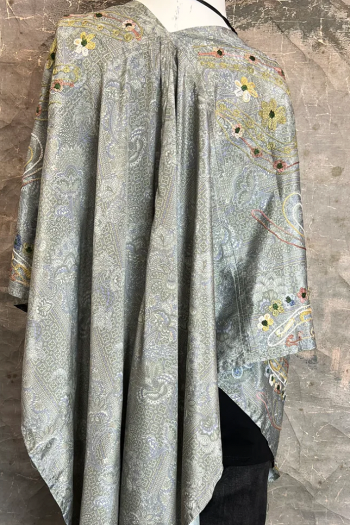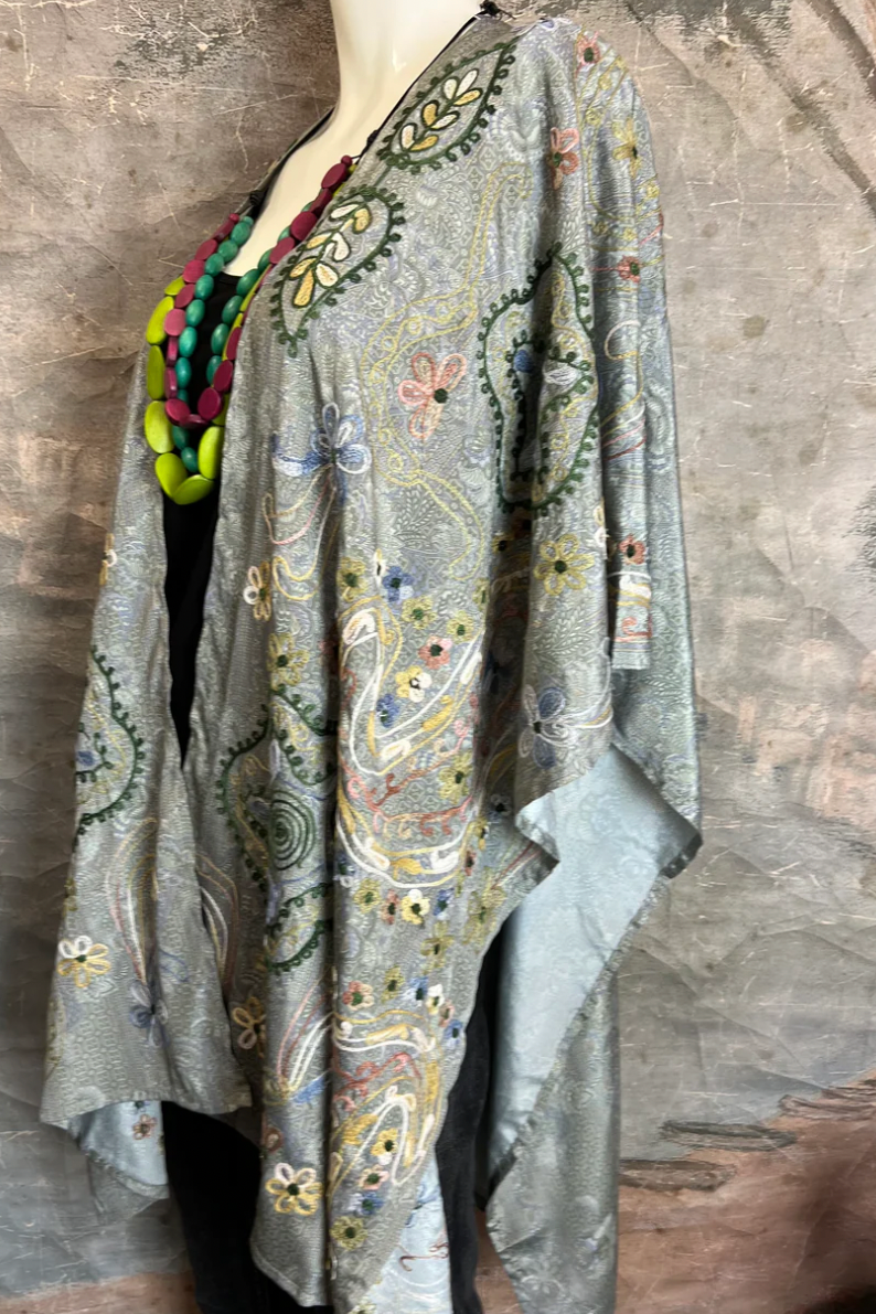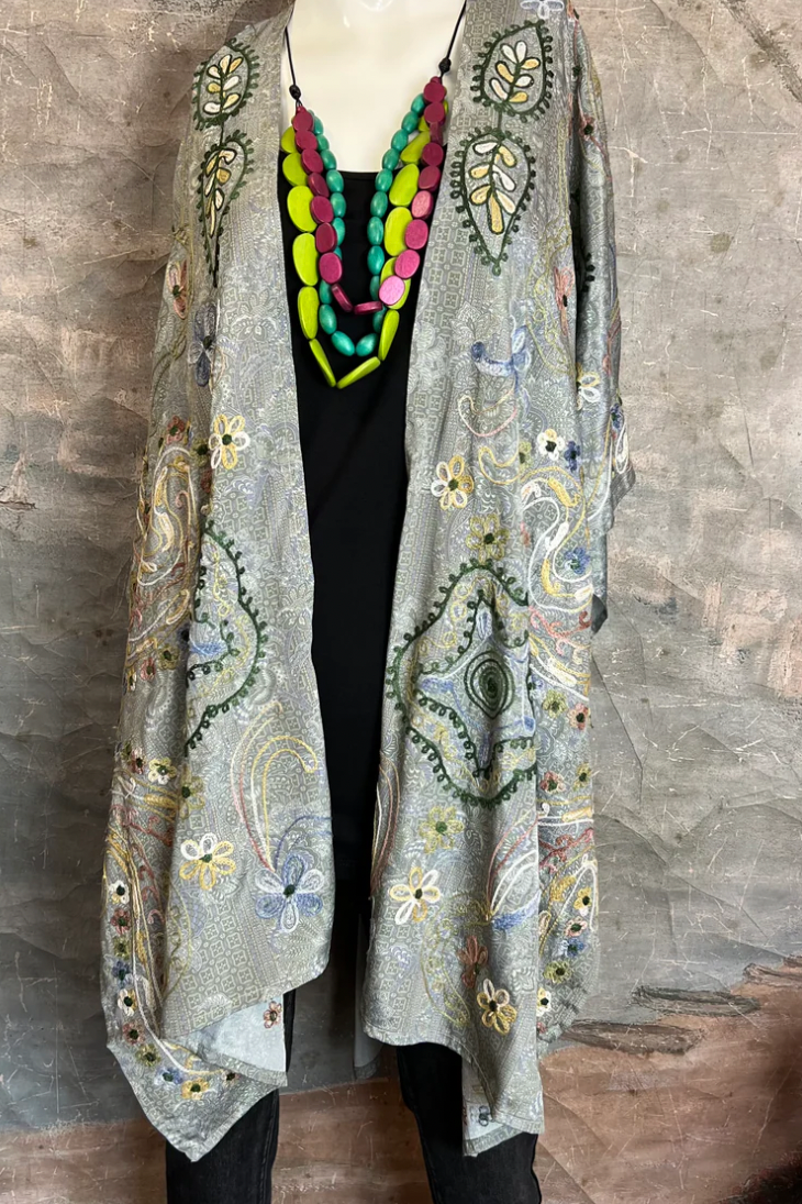 Product features: open front and sides, front panels can be worn down or wrapped over shoulder as a shawl, v-neck on back, mid-thigh to knee length depending on height