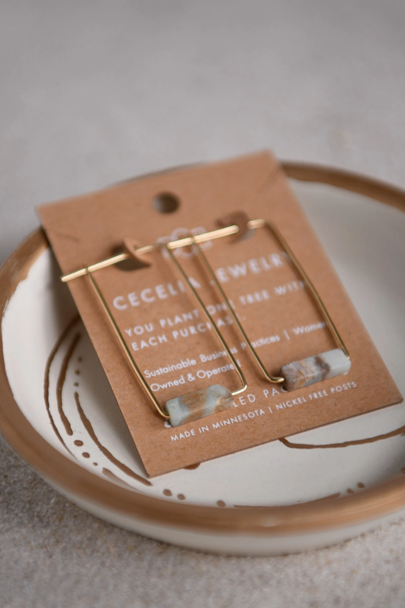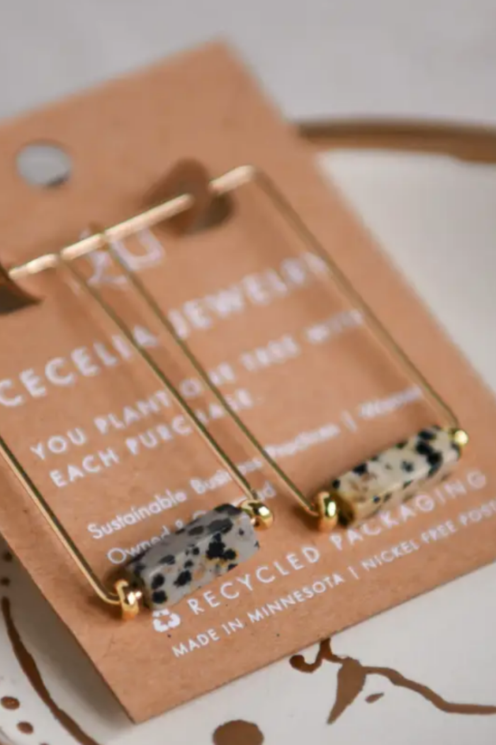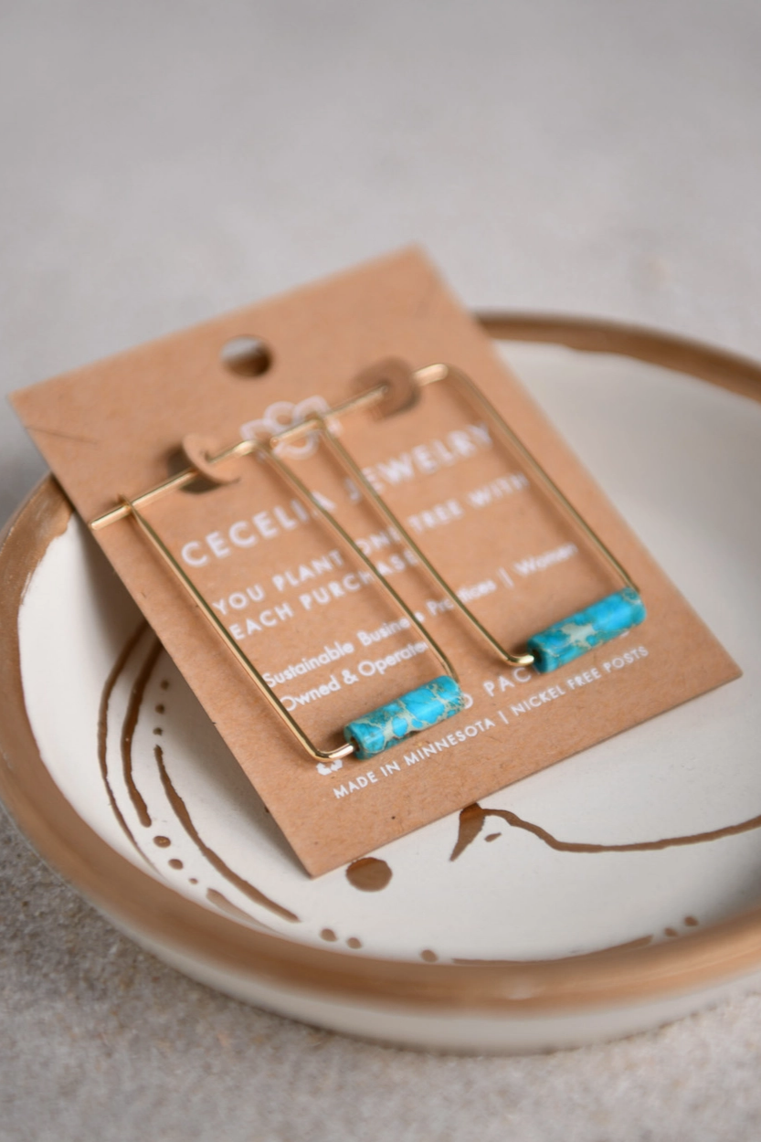 Shop our Eventide beaded rectangle hoop earring collection. These lightweight and versatile earrings are made with a gold-plated rectangle and are approximately 2.5" in length. Handmade in Minnesota. You plant one tree with each purchase.