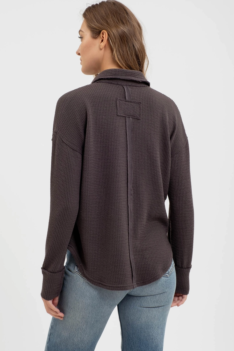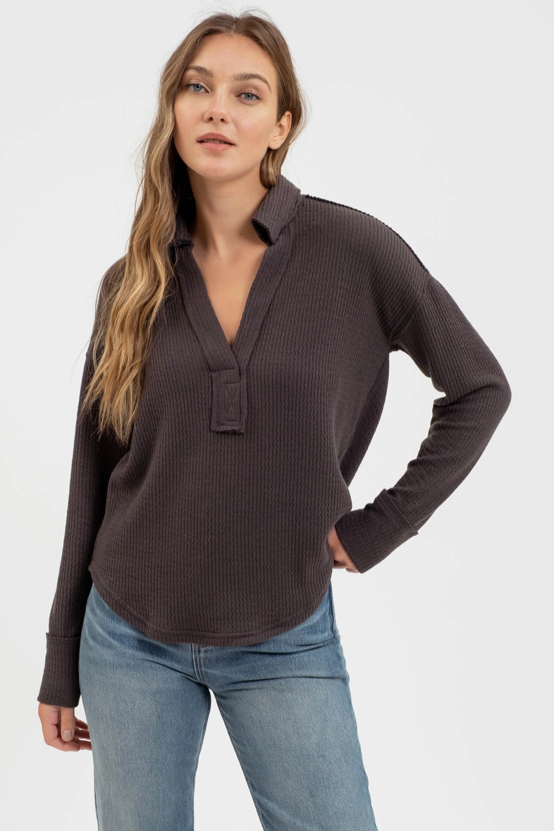This knit top is a must to add to your closet this fall/winter season. The Exposed Seam Knit Top has a split neck and is collared, elevating your look.
