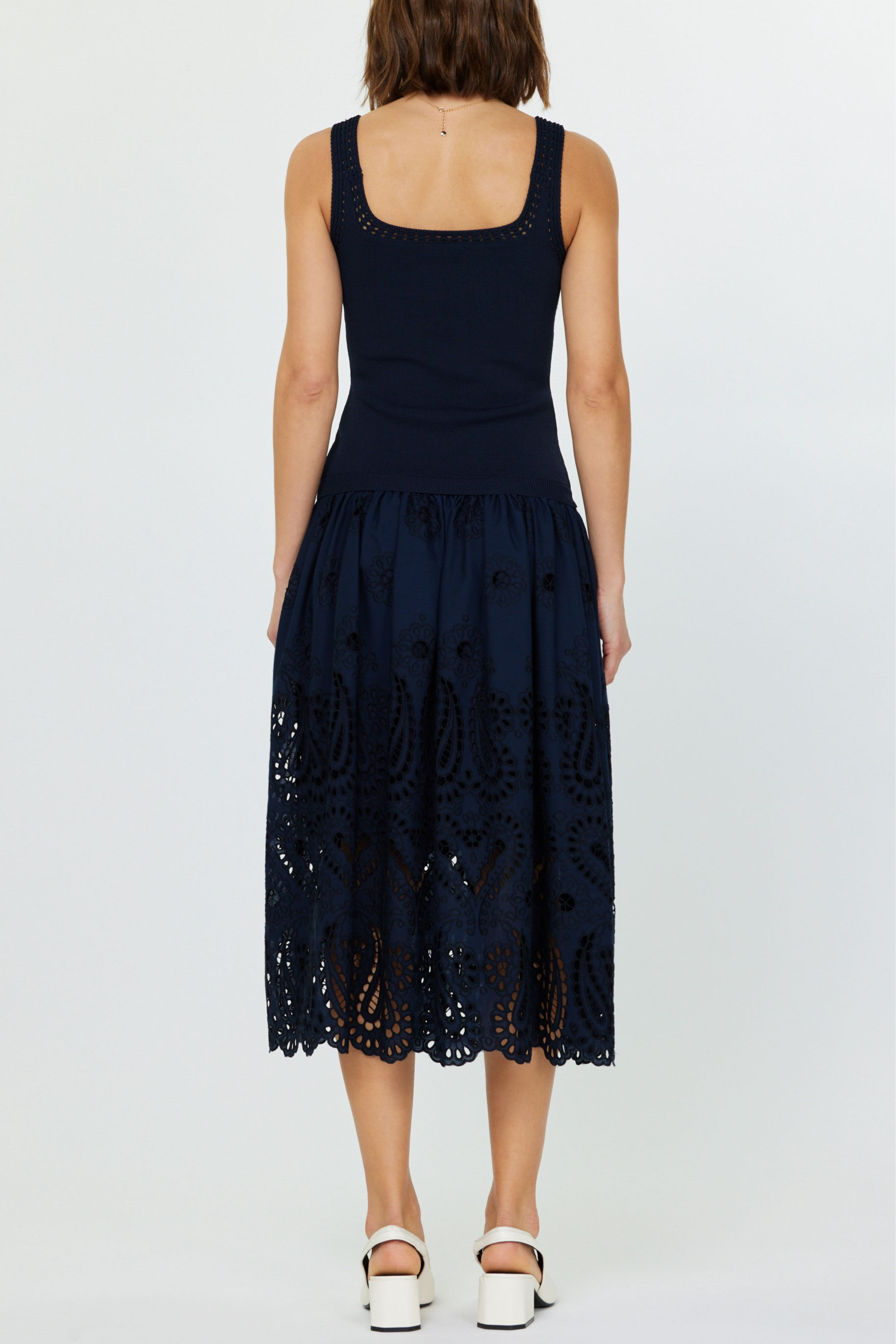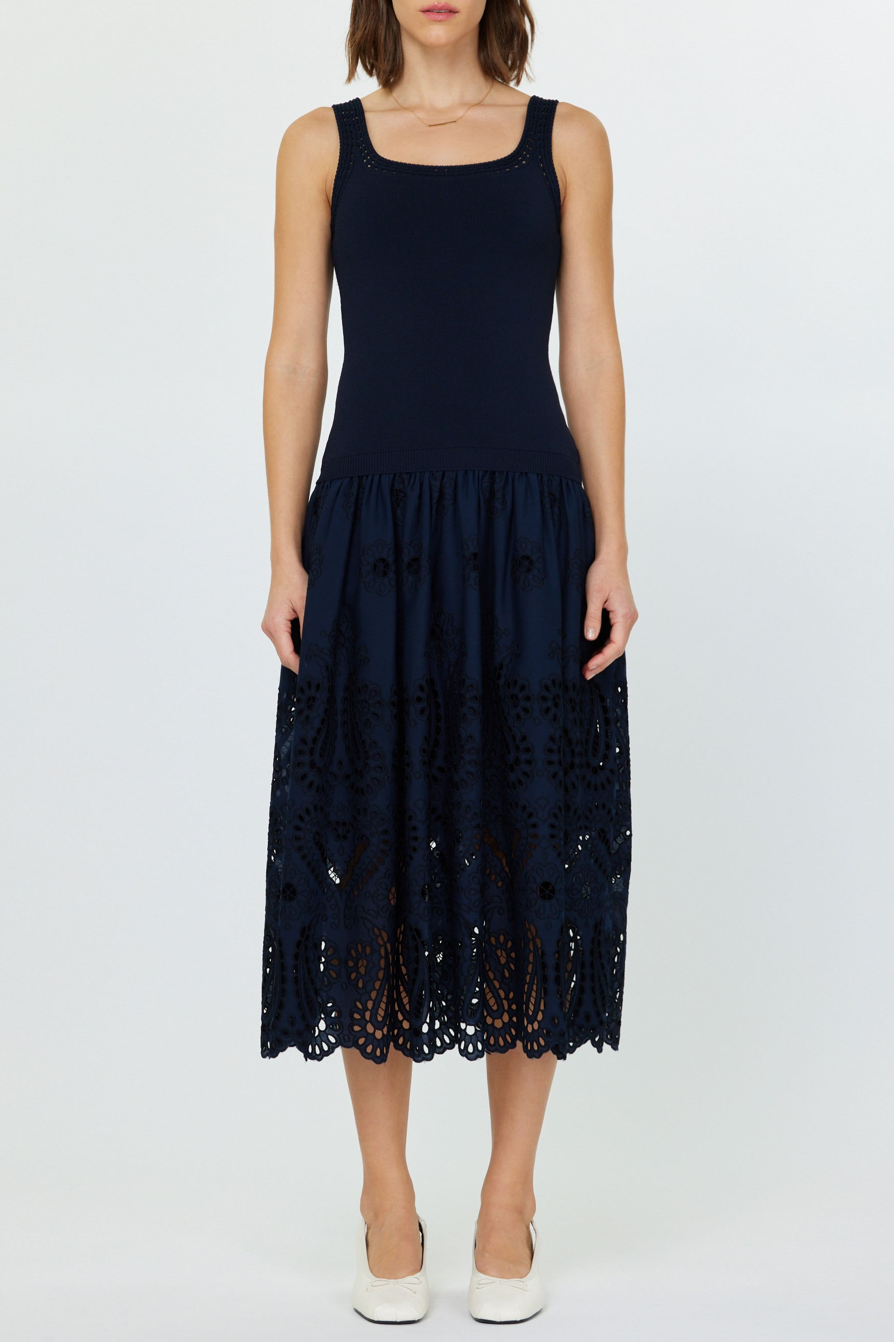 The Eyelet Tank Dress is a stylish and breezy outfit that combines a fitted tank-style bodice with a feminine, eyelet-detailed skirt. The top of this dress has a stretchy and comfortable fit. The bottom of the dress is adorned with delicate eyelet embroidery, adding texture and a touch of elegance. This dress is perfect for warm weather occasions, offering a balance of casual charm and effortless sophistication.