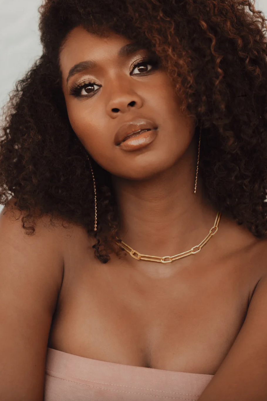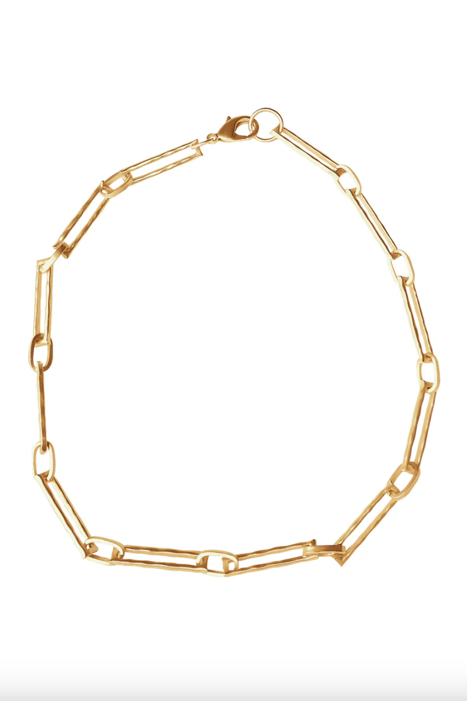 The paperclip chain necklace is given a modern twist with its textured links, creating a contemporary aesthetic.