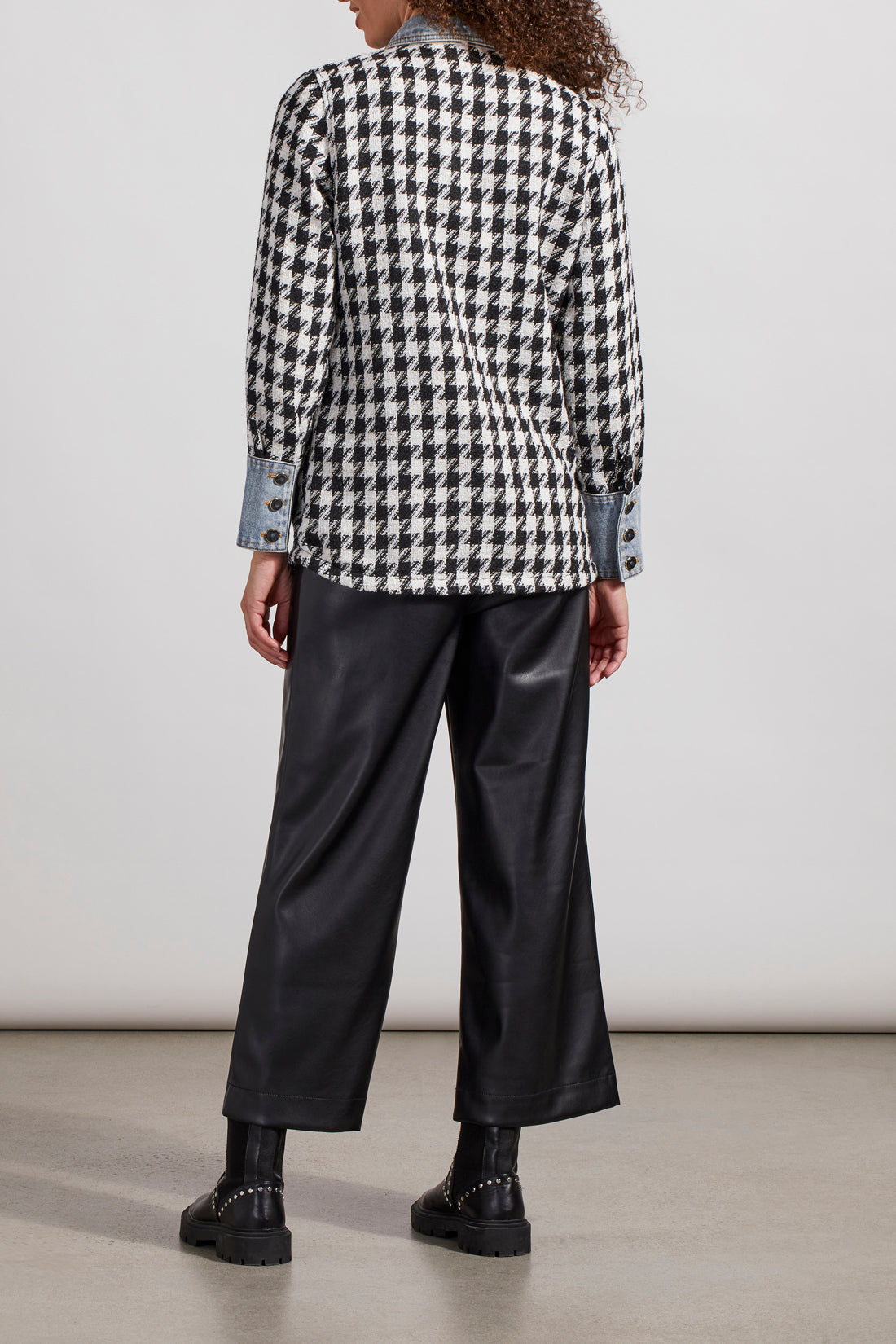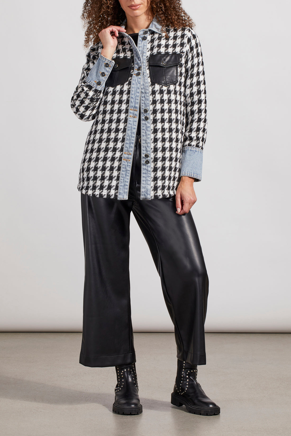 Feel modern and chic in this fancy shacket. The houndstooth pattern, mixed with faux leather pockets, and denim lining makes this shacket unique and a staple piece to wear.