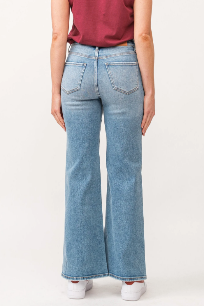 High rise clean hem wide leg jeans in button fly with an exceptional blend of comfort and fit. Crafted with a perfect balance of cotton, polyester, and spandex for a lasting, versatile wear. These jeans are ideal for any lifestyle, offering a sleek and polished look with functional pouch pockets for every occasion.